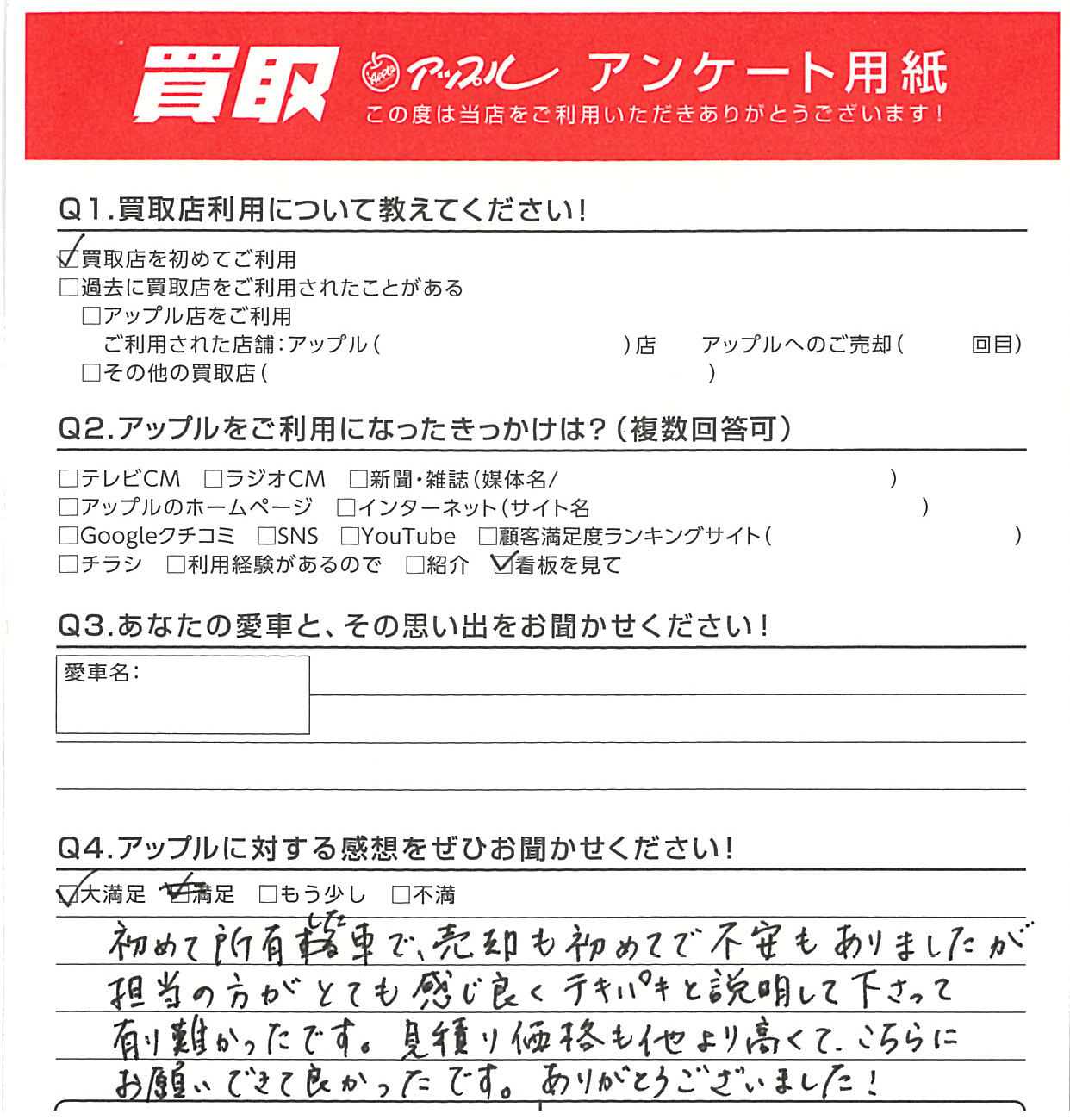 A. 初めて所有した車で、売却も初めてで不安もありましたが担当の方がとても感じ良くテキパキと説明して下さって有難かったです。