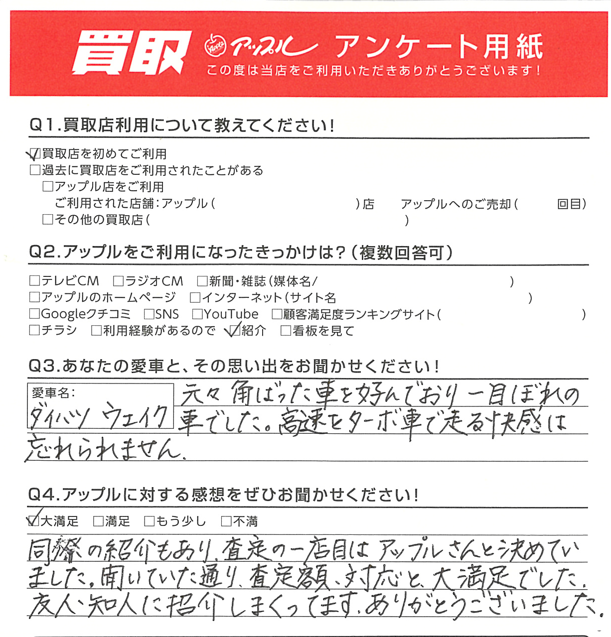 A. 同僚の紹介もあり、査定の一店目はアップルさんと決めていました。聞いていた通り、査定額、対応と、大満足でした。