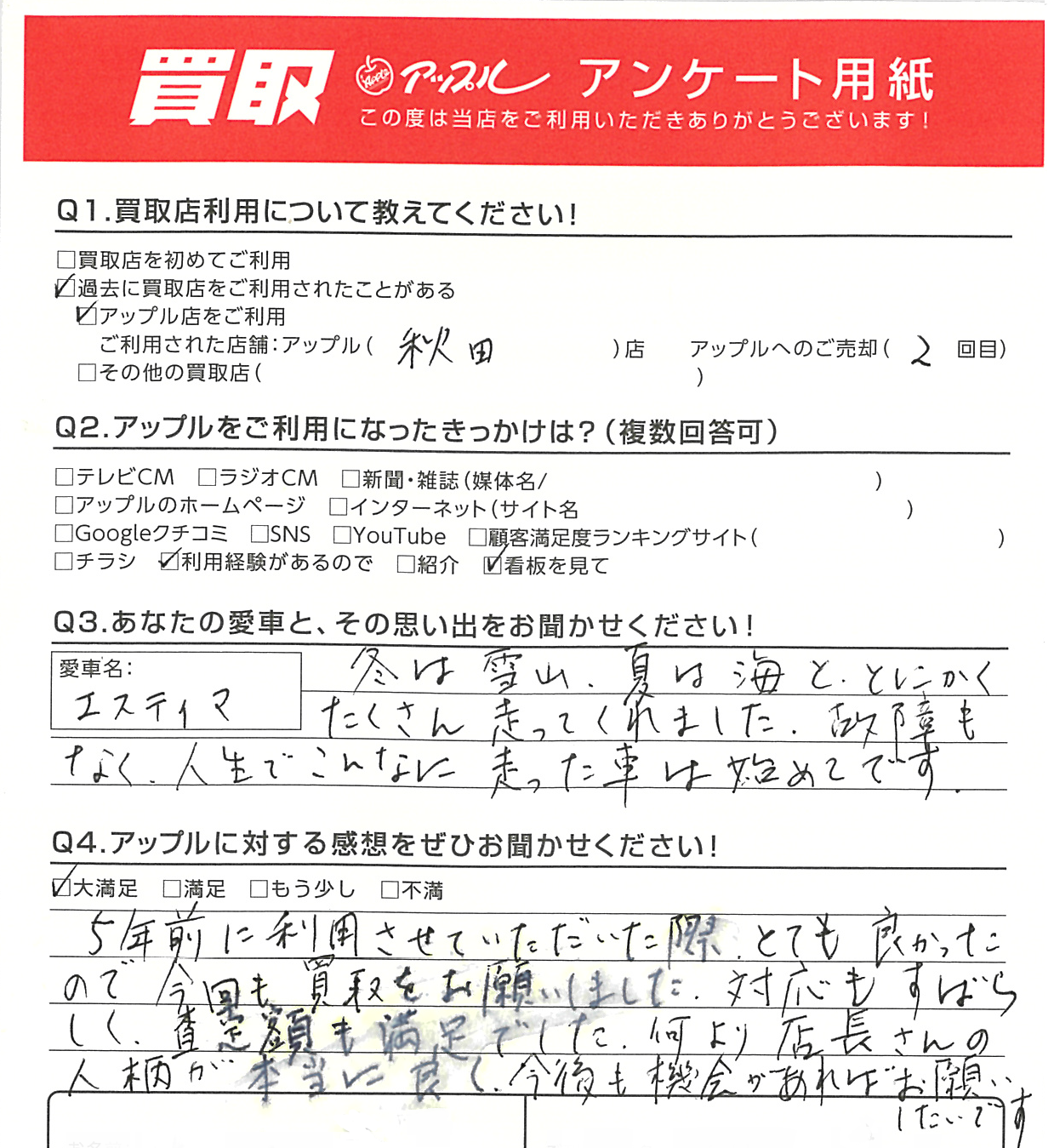 秋田県 匿名様 車名:トヨタ エスティマハイブリッド