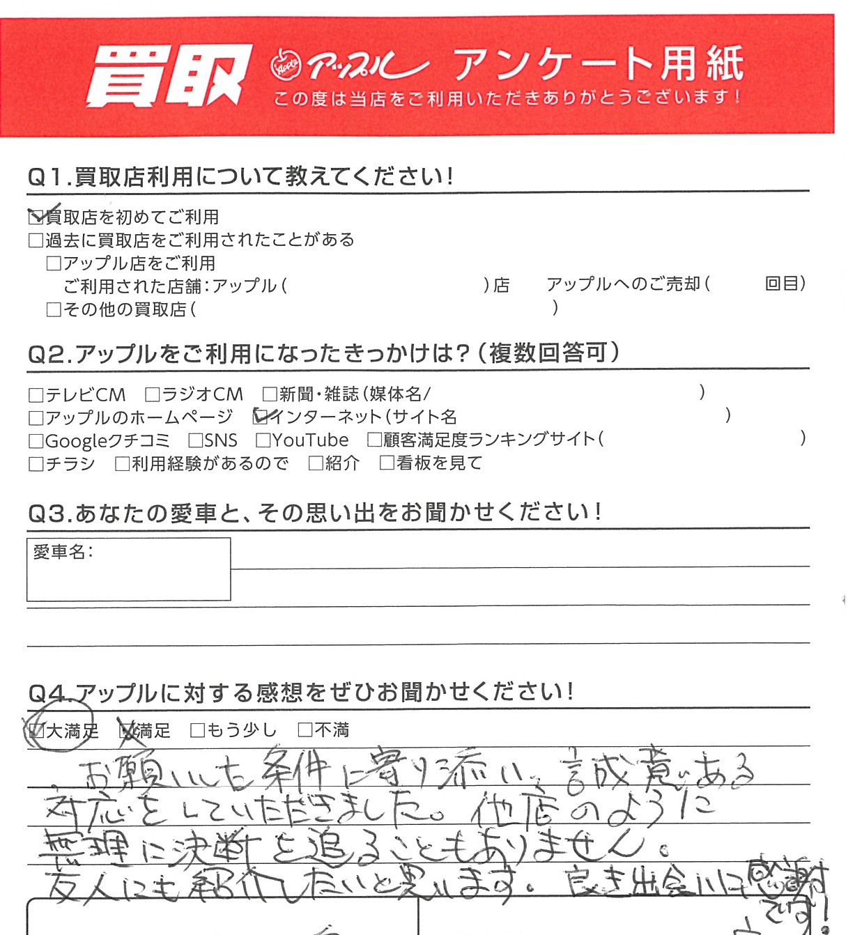 A. お願いした条件に寄り添い、誠意ある対応をしていただきました。他店のように無理に決断を迫ることもありません。