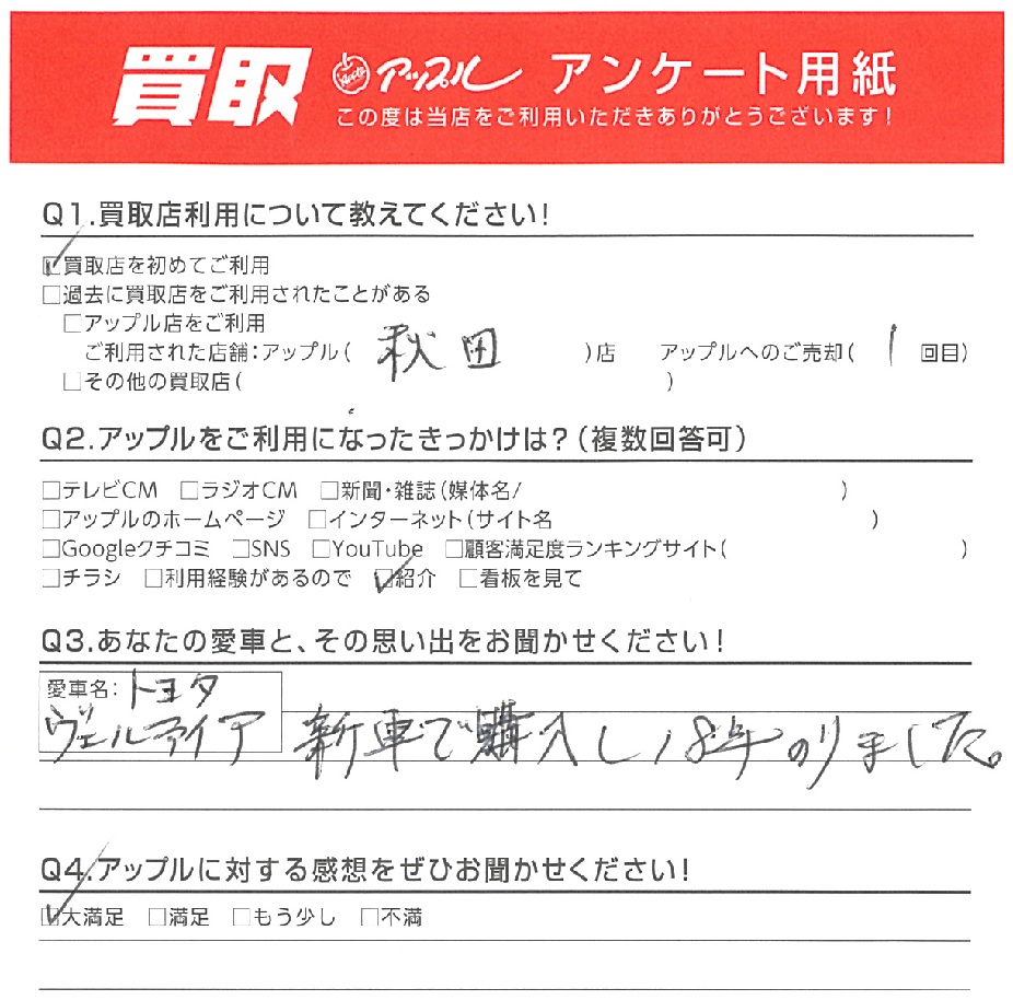 秋田県 匿名様 車名:トヨタ ヴェルファイア(H27年1月~のHYBRID含む)