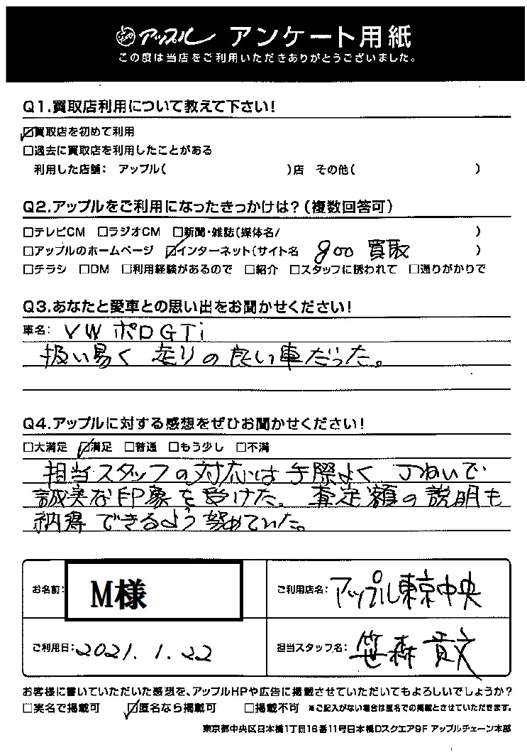 担当スタッフの対応は手際よく丁ねいで誠実な印象を受けた。査定額の説明も納得できるよう努めていた。