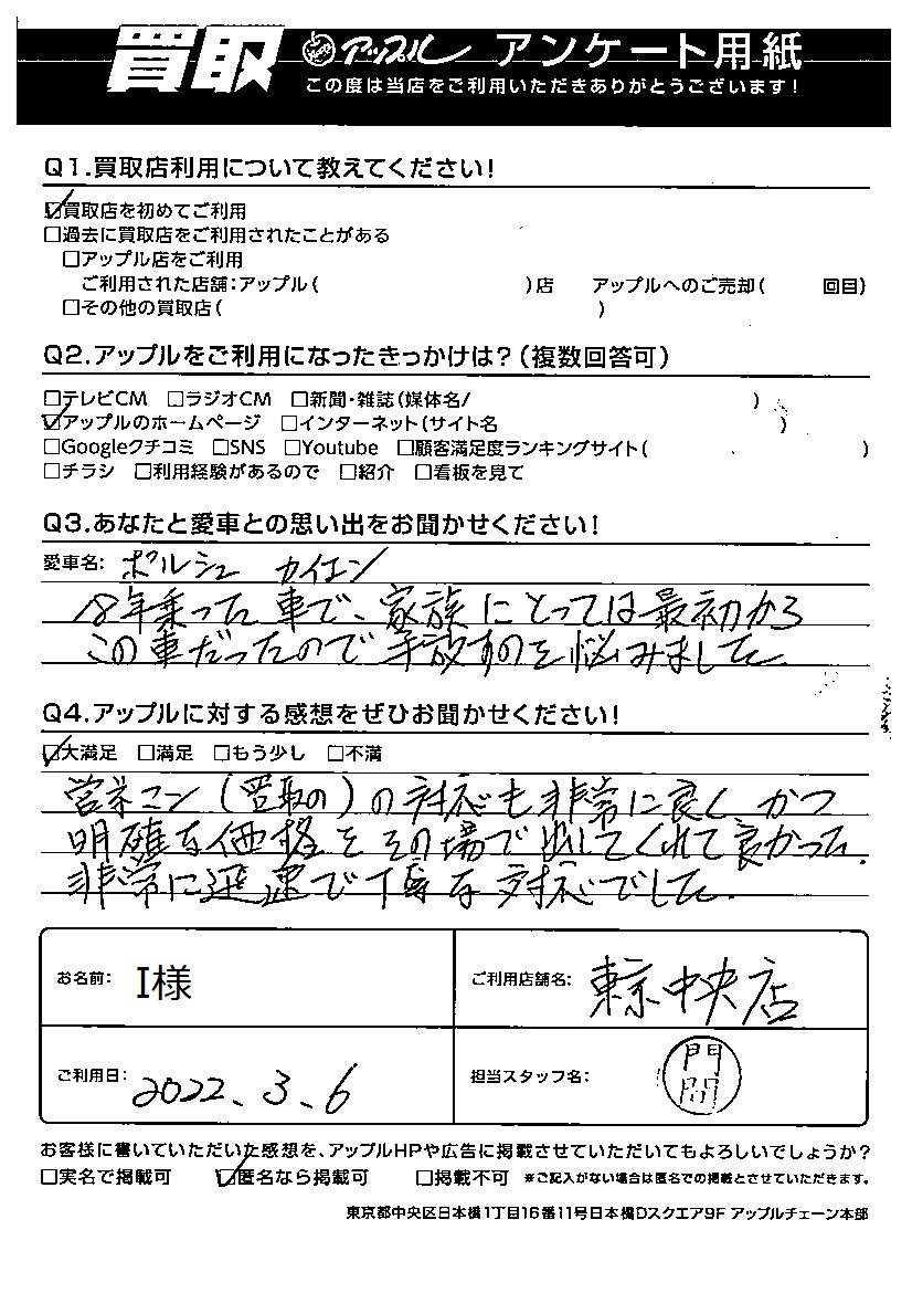 営業マン(買取の)の対応も非常に良くかつ明確な価格をその場で出してくれて良かった。非常に迅速で丁寧な対応でした。