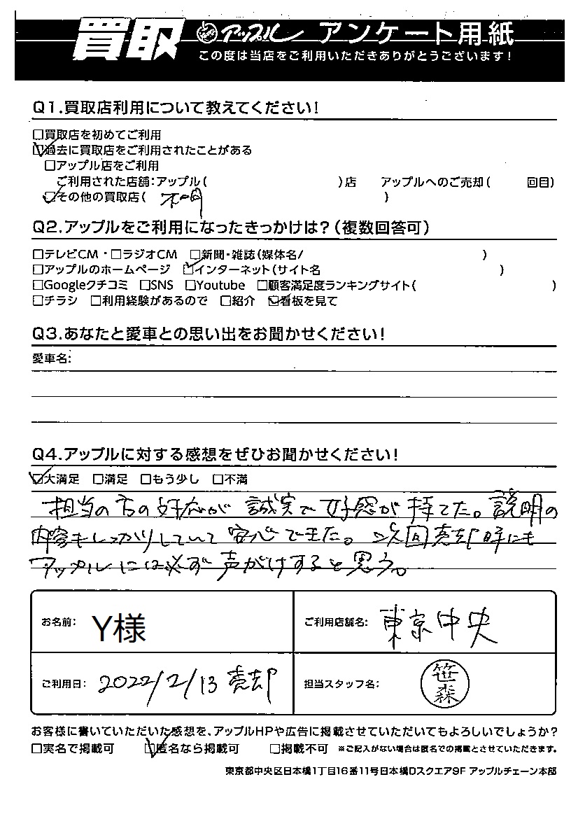 担当の方の対応が誠実で好感が持てた。説明の内容もしっかりしていて安心できた。次回売却時にもアップルには必ず声がけすると思う。