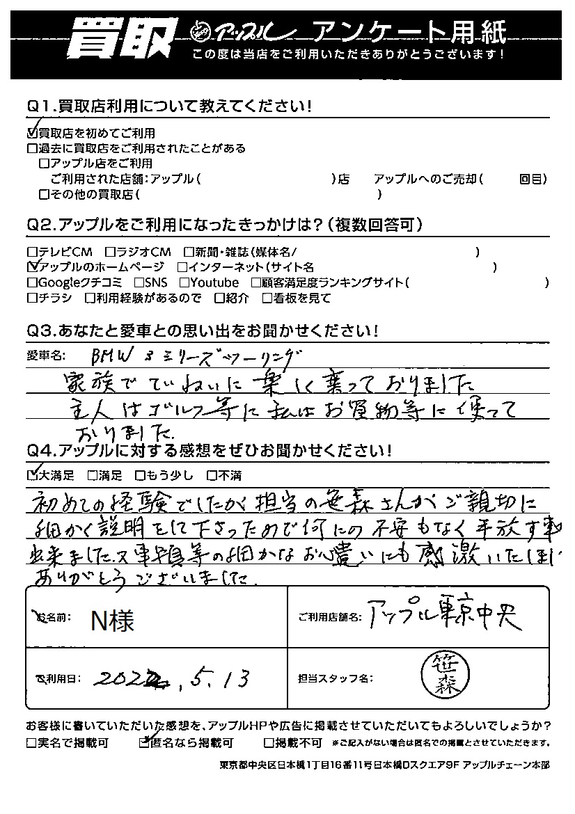 初めての経験でしたが担当の笹森さんがご親切に細かく説明をして下さったので何の不安もなく手放す事が出来ました。又車両等の細かなお心遣いにも感激致しました。ありがとうございました。