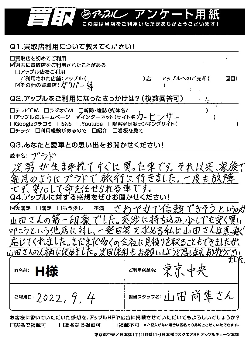 次男が生まれてすぐに買った車です。それ以来、家族で毎月のようにプラドで旅行に行きました。一度も故障せず、安心して命を任せられる車です。