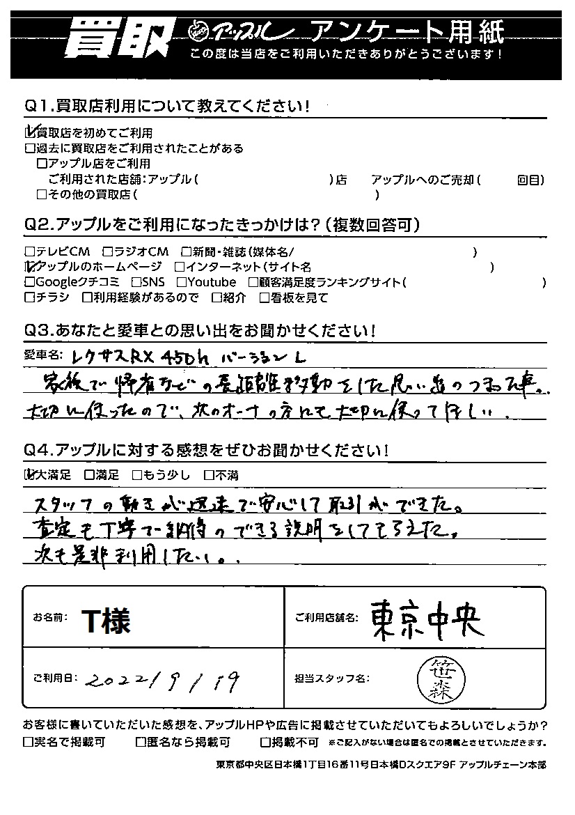 T様 車名:レクサス RX (国内仕様 右H(H27年10月~HYBRID含)