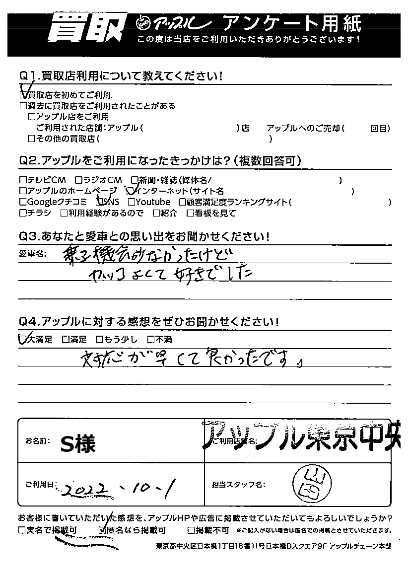 お車のご相談・ 査定だけでもOK! カンタン 入力 30秒 アップルがブランド買取始めました! お電話でも受付中! 受付時間10:00 ~ 19:00 03-6402-3700 お車のご相談・ 査定だけでもOK! カンタン 入力 30秒 アップルがブランド買取始めました! お電話でも受付中! 受付時間10:00 ~ 19:00 03-6402-3700 アップルがブランド買取始めました! お電話でも受付中! 受付時間10:00 ~ 19:00 03-6402-3700 店舗情報 在庫車 スタッフ紹介 ブログ お客様の声 キャンペーン 無料査定 click お客様の声 ご記入日: 2022/10/01 S様 Q あなたと愛車の思い出をお聞かせください車名:乗る機会少なかったけど、カッコよくて好きでした。Q アップルに対する感想をぜひお聞かせください感想:大満足対応が早くて良かったです。 前へ 次へ お客様の声一覧を見る