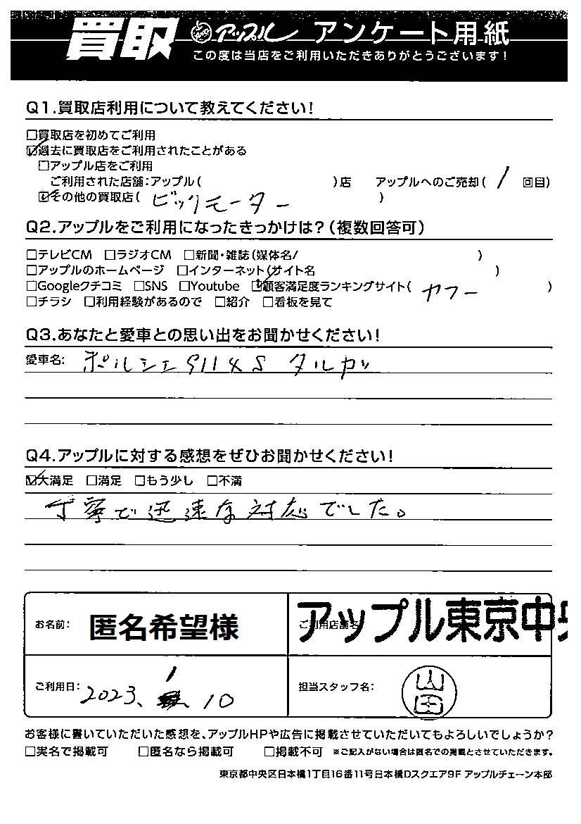 お車のご相談・ 査定だけでもOK! カンタン 入力 30秒 アップルがブランド買取始めました! お電話でも受付中! 受付時間10:00 ~ 19:00 03-6402-3700 お車のご相談・ 査定だけでもOK! カンタン 入力 30秒 アップルがブランド買取始めました! お電話でも受付中! 受付時間10:00 ~ 19:00 03-6402-3700 アップルがブランド買取始めました! お電話でも受付中! 受付時間10:00 ~ 19:00 03-6402-3700 店舗情報 在庫車 スタッフ紹介 ブログ お客様の声 キャンペーン 無料査定 click お客様の声 ご記入日: 2023/01/10 匿名希望様 車名:ポルシェ 911 Q あなたと愛車の思い出をお聞かせください車名:ポルシェ911SタルガQ アップルに対する感想をぜひお聞かせください感想:大満足丁寧で迅速な対応でした。 前へ 次へ お客様の声一覧を見る
