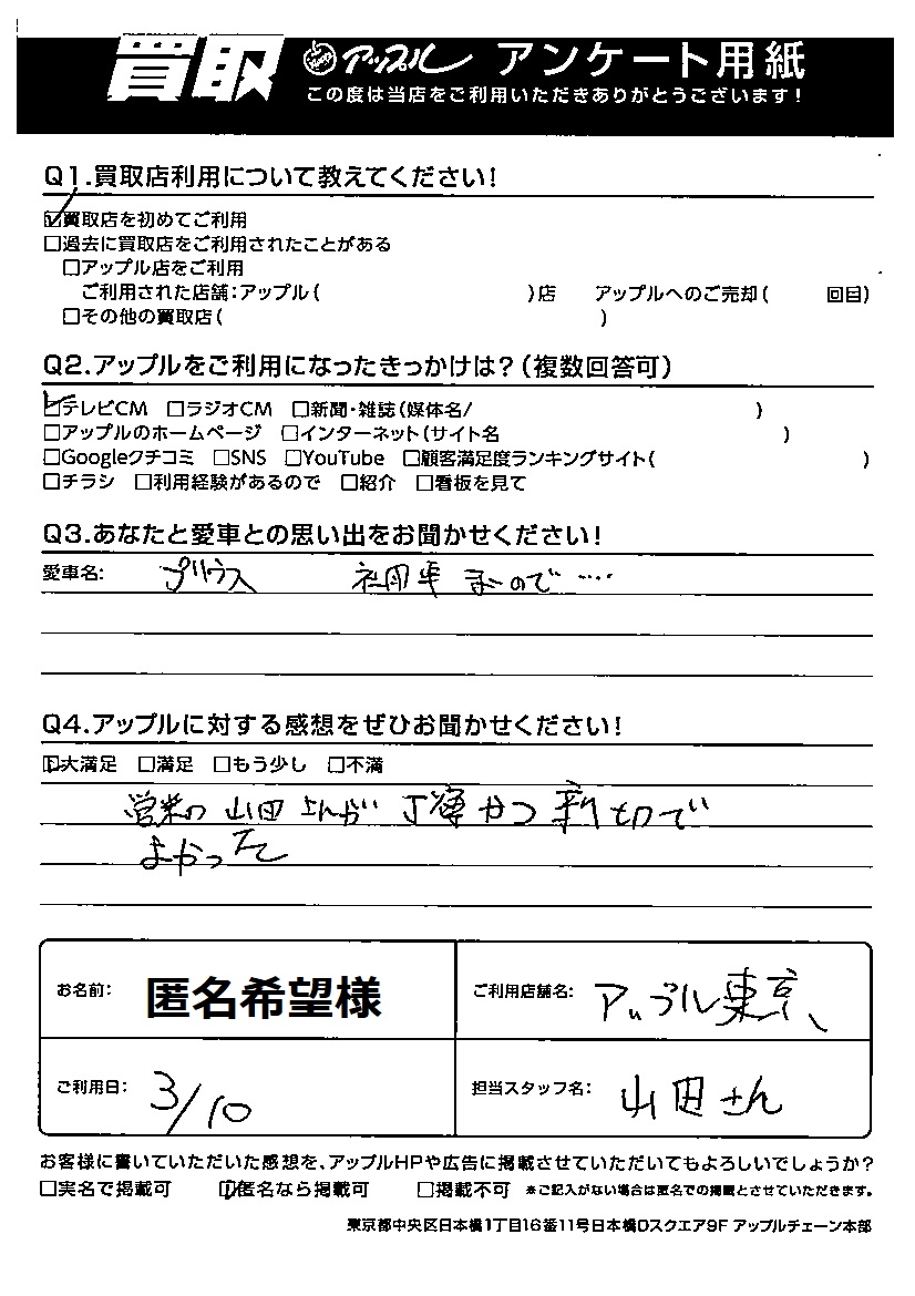 お車のご相談・ 査定だけでもOK! カンタン 入力 30秒 アップルがブランド買取始めました! お電話でも受付中! 受付時間10:00 ~ 19:00 03-6402-3700 お車のご相談・ 査定だけでもOK! カンタン 入力 30秒 アップルがブランド買取始めました! お電話でも受付中! 受付時間10:00 ~ 19:00 03-6402-3700 アップルがブランド買取始めました! お電話でも受付中! 受付時間10:00 ~ 19:00 03-6402-3700 店舗情報 在庫車 スタッフ紹介 ブログ お客様の声 キャンペーン 無料査定 click お客様の声 ご記入日: 2023/03/10 匿名希望様 車名:トヨタ プリウス(2023年3月~のPHVを含む) Q あなたと愛車の思い出をお聞かせください車名:プリウス 社用車Q アップルに対する感想をぜひお聞かせください感想:大満足営業の山田さんが丁寧かつ親切でよかった 前へ 次へ お客様の声一覧を見る