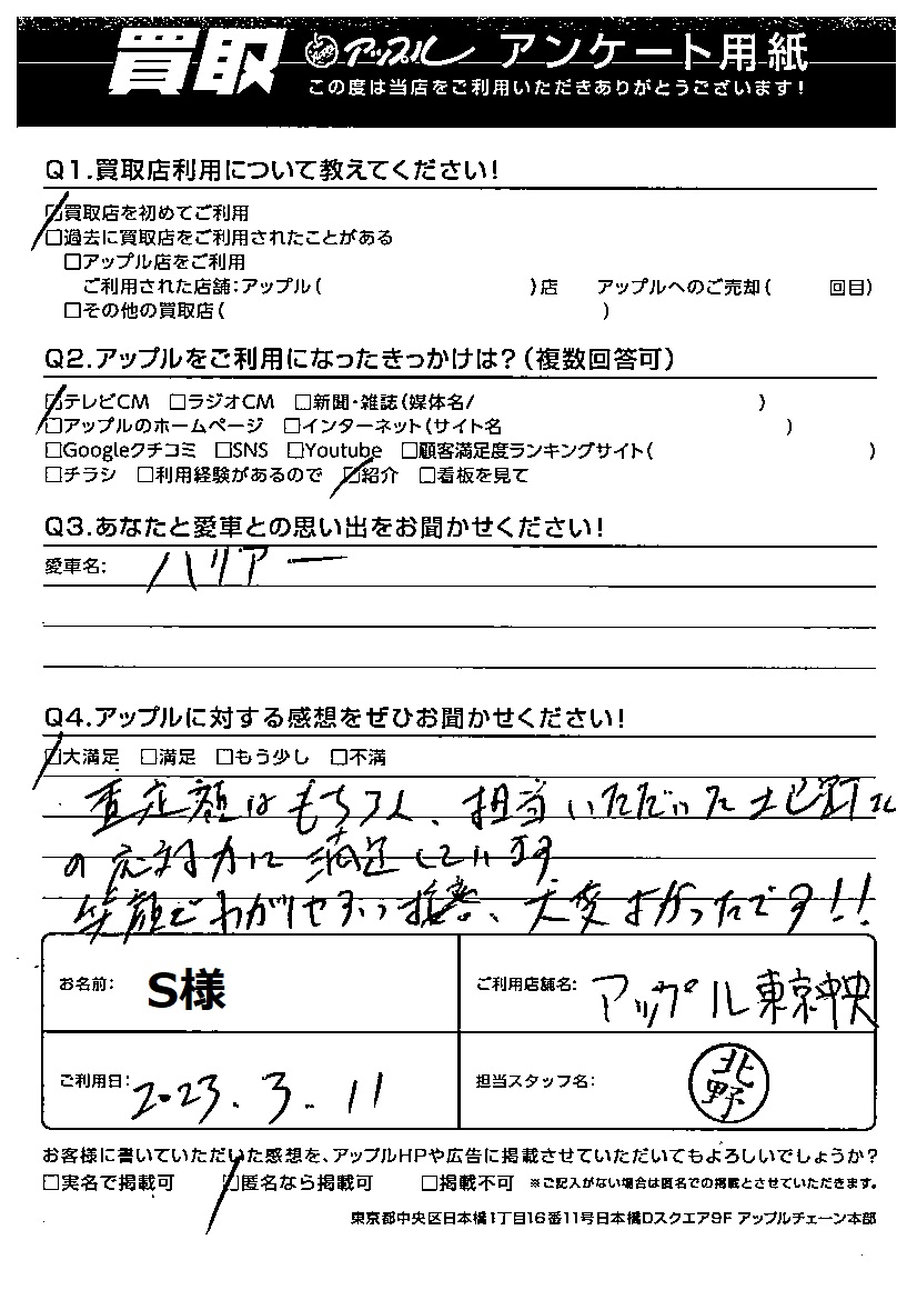 査定額はもちろん、担当いただいた北野さんの応対力に満足しています。