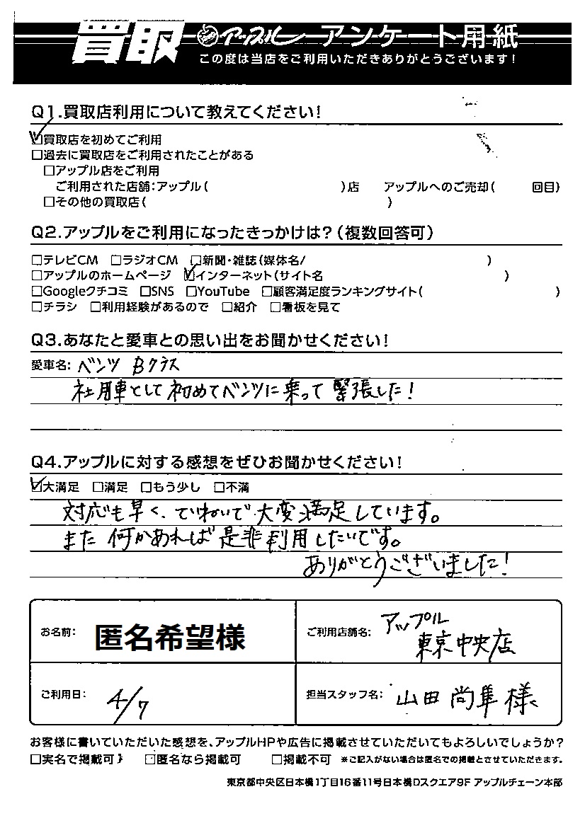 匿名希望様 車名:メルセデス・ベンツ Bクラス