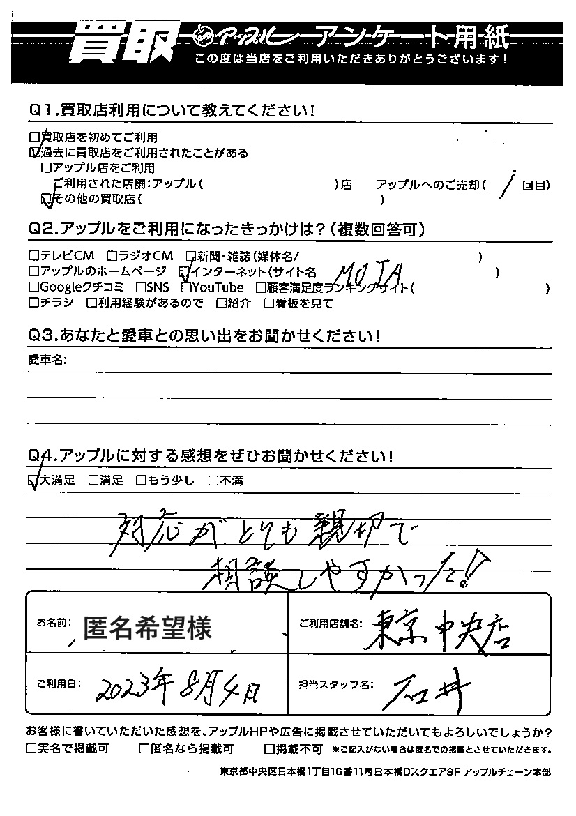お車のご相談・ 査定だけでもOK! カンタン 入力 30秒 アップルがブランド買取始めました! お電話でも受付中! 受付時間10:00 ~ 19:00 03-6402-3700 お車のご相談・ 査定だけでもOK! カンタン 入力 30秒 アップルがブランド買取始めました! お電話でも受付中! 受付時間10:00 ~ 19:00 03-6402-3700 アップルがブランド買取始めました! お電話でも受付中! 受付時間10:00 ~ 19:00 03-6402-3700 店舗情報 在庫車 スタッフ紹介 ブログ お客様の声 キャンペーン 無料査定 click お客様の声 ご記入日: 2023/08/04 匿名希望様 Q あなたと愛車の思い出をお聞かせください車名:Q アップルに対する感想をぜひお聞かせください感想:大満足対応がとても親切で相談しやすかった!! 前へ 次へ お客様の声一覧を見る