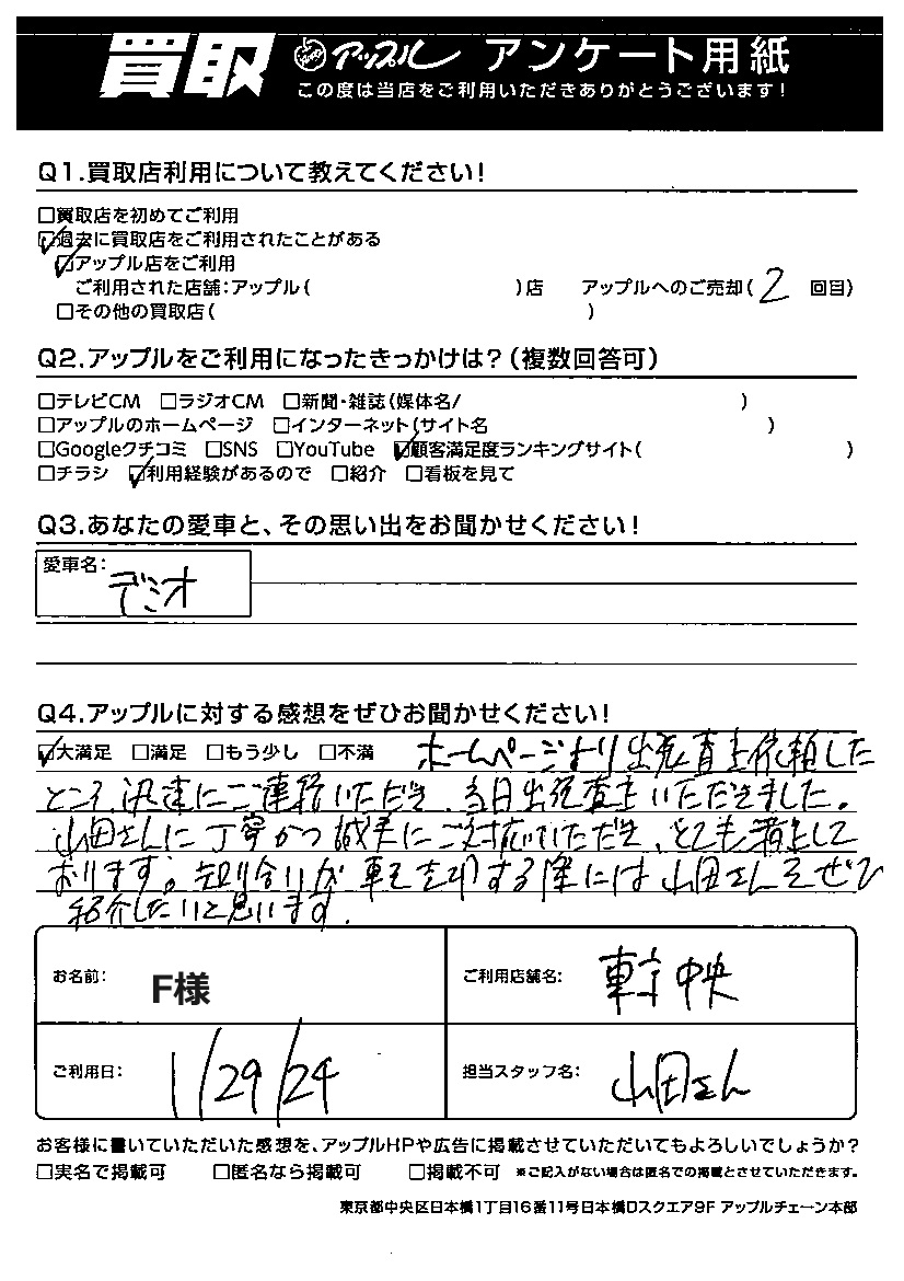 ホームページより主張査定依頼したところ、迅速にご連絡いただき、当日出張査定いただきました。