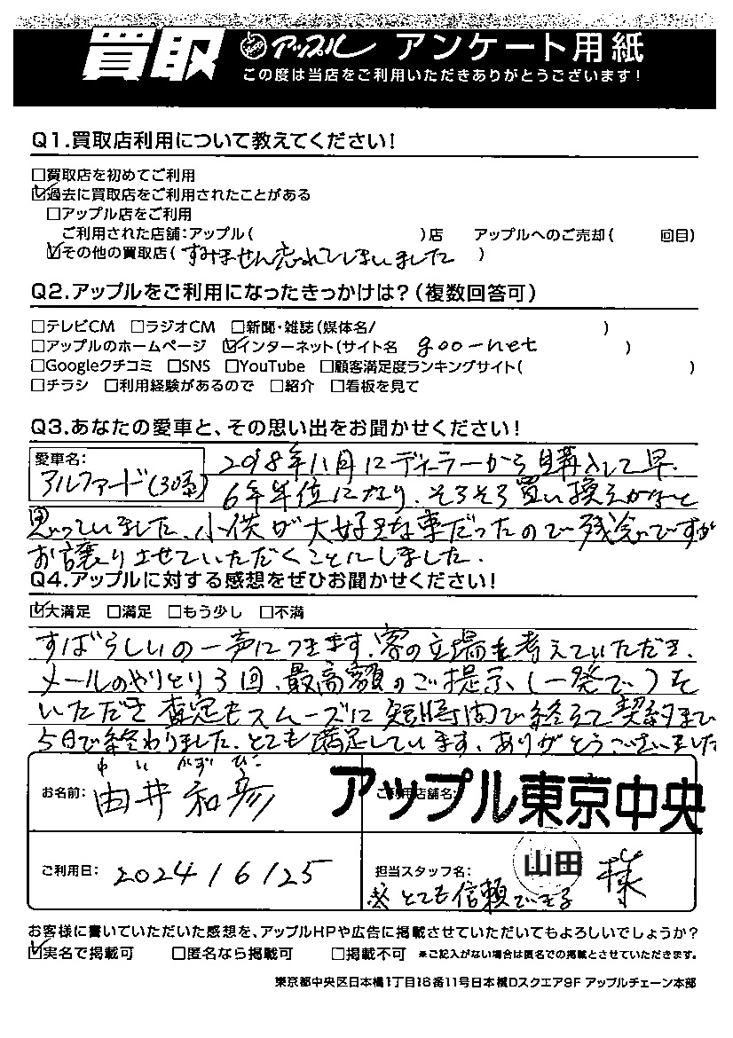 すばらしいの一声につきます。客の立場を考えていただき、メールのやりとり3回、最高額のご提示(一発で)をいただき査定もスムーズに短時間で終えて契約まで5日で終わりました。とても満足しています。ありがとうございました。