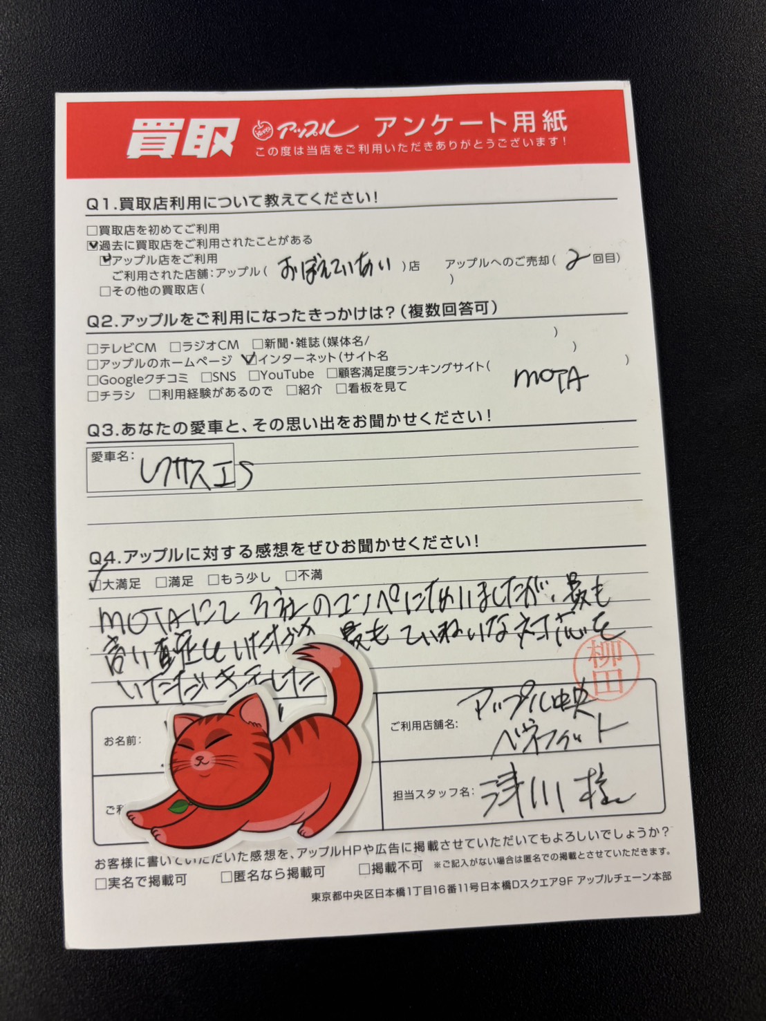 MOTAにて3社のコンペになりましたが、最も高い査定をいただき、最もていねい対応をいただきました。