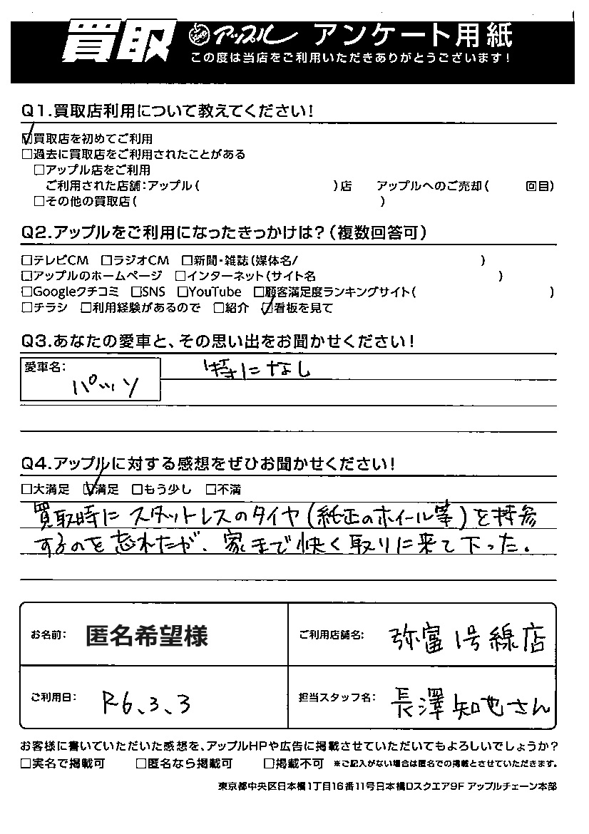 お車のご相談・ 査定だけでもOK! カンタン 入力 30秒 アップルがブランド買取始めました! お電話でも受付中! 受付時間10:00 ~ 19:00 0567-64-1300 お車のご相談・ 査定だけでもOK! カンタン 入力 30秒 アップルがブランド買取始めました! お電話でも受付中! 受付時間10:00 ~ 19:00 0567-64-1300 アップルがブランド買取始めました! お電話でも受付中! 受付時間10:00 ~ 19:00 0567-64-1300 店舗情報 在庫車 スタッフ紹介 ブログ お客様の声 キャンペーン 無料査定 click お客様の声 ご記入日: 2024/03/03 匿名希望様 車名:トヨタ パッソ 愛車名:パッソ【アップルに対する感想をぜひお聞かせ下さい!】満足!買取時にスタッドレスのタイヤ(純正のホイール等)を持参するのを忘れたが、家まで快く取りに来て下さった。担当:長澤 前へ 次へ お客様の声一覧を見る