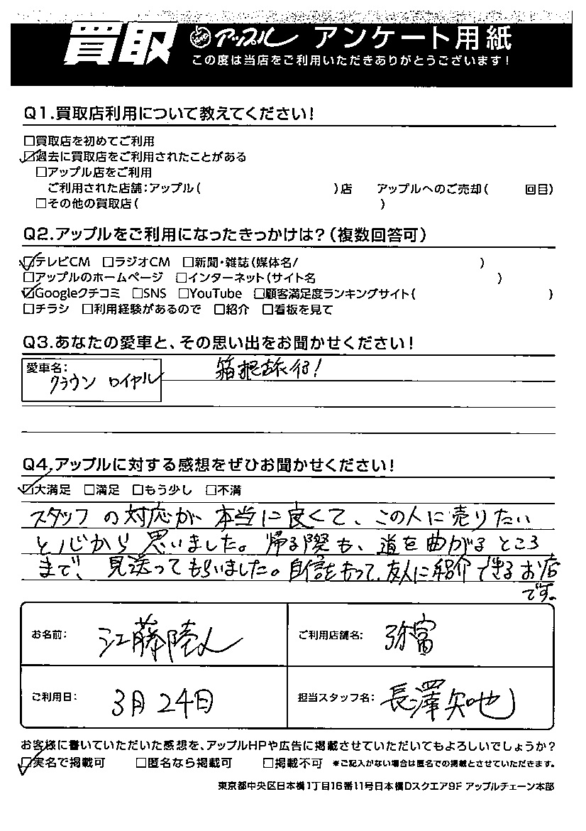 スタッフの対応が本当に良くて、この人に売りたいと心から思いました。帰る際も、道を曲がるところまで、見送ってもらいました。自信をもって友人に紹介できるお店です。