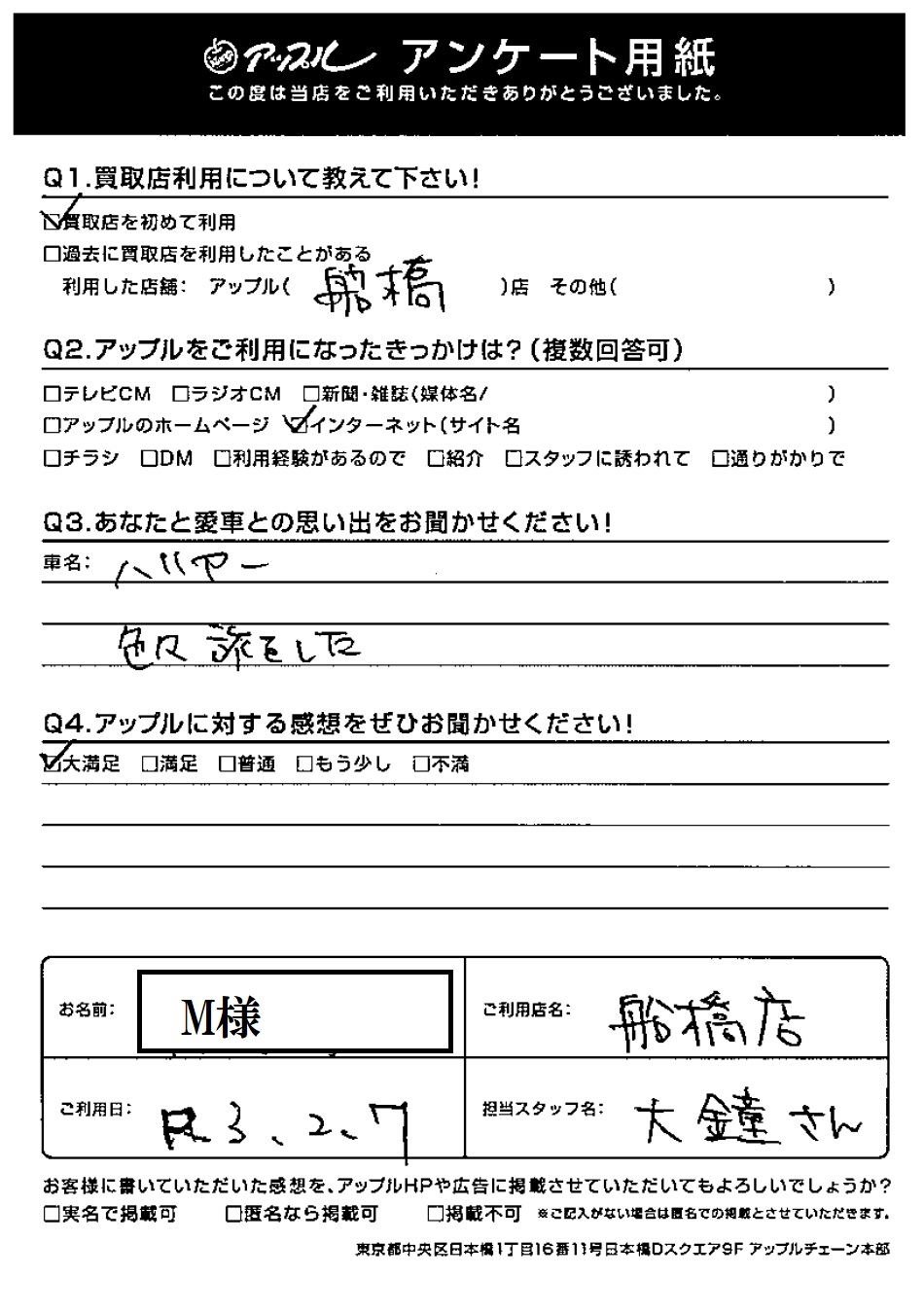 お車のご相談・ 査定だけでもOK! カンタン 入力 30秒 アップルがブランド買取始めました! お電話でも受付中! 受付時間10:00 ~ 18:30 047-460-2208 お車のご相談・ 査定だけでもOK! カンタン 入力 30秒 アップルがブランド買取始めました! お電話でも受付中! 受付時間10:00 ~ 18:30 047-460-2208 アップルがブランド買取始めました! お電話でも受付中! 受付時間10:00 ~ 18:30 047-460-2208 店舗情報 在庫車 スタッフ紹介 ブログ お客様の声 キャンペーン お得 無料査定 click お客様の声 ご記入日: 2021/02/07 M様 車名:トヨタ ハリアー (H25年12月~のハイブリッド含む) Q あなたと愛車との思い出をお聞かせください!色々旅をしたQ アップルに対する感想をぜひお聞かせください!感想:大満足 前へ 次へ お客様の声一覧を見る