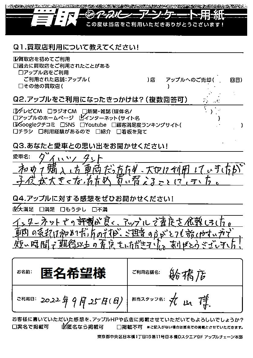 ご担当の方がとても話しやすい方で短い時間で期待以上の査定をいただきました。