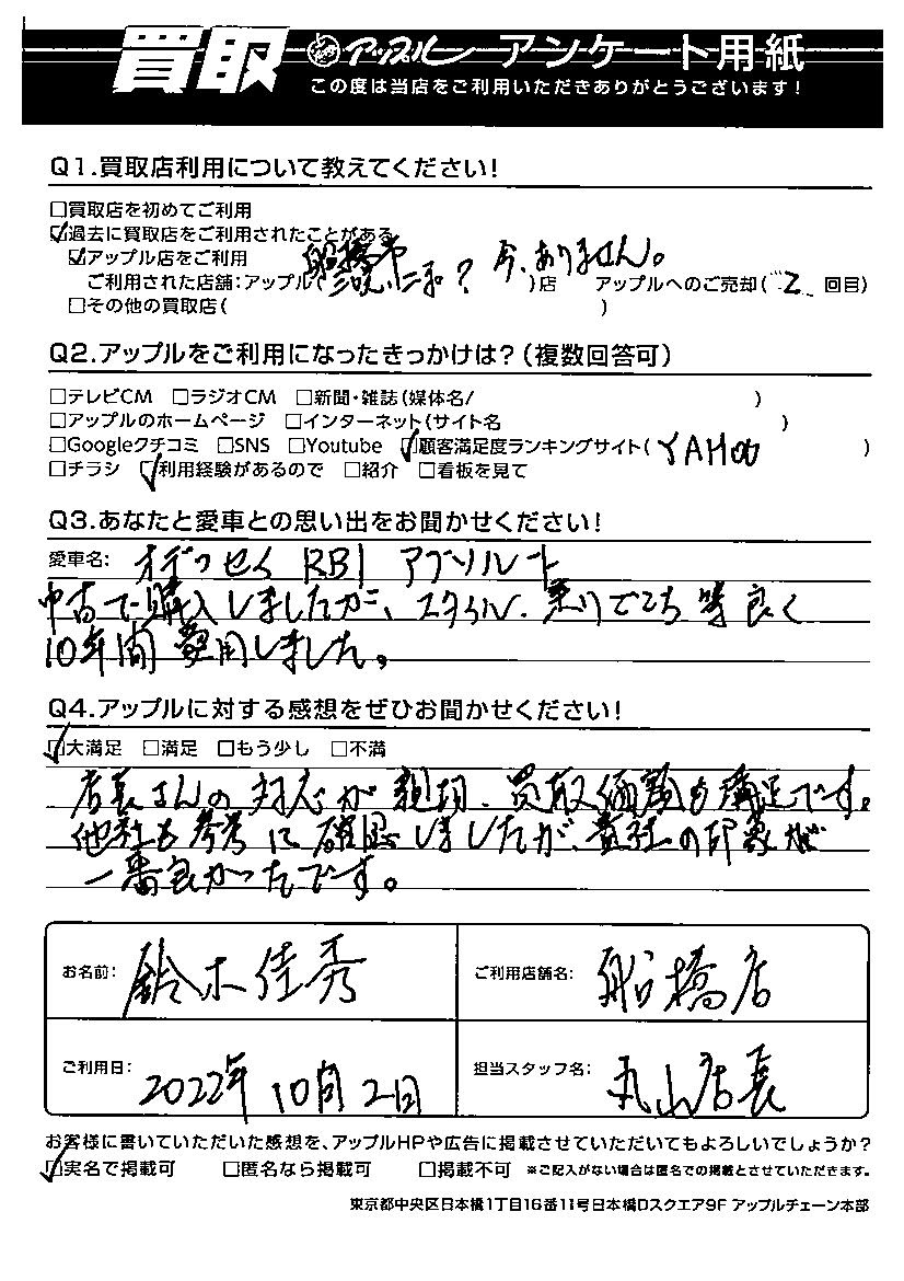 ご利用日:2022/10/2 鈴木 佳秀 様