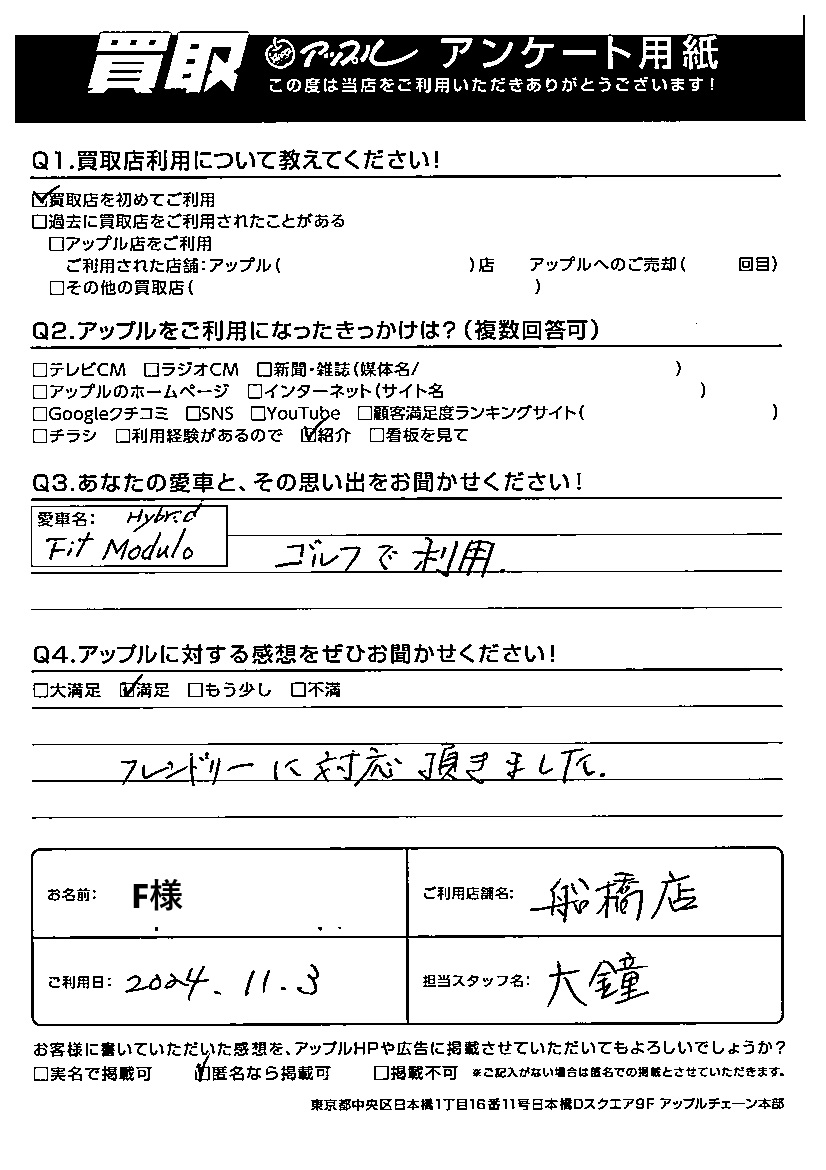 F様 車名:ホンダ フィット(H25年9月以降のハイブリッド含む)