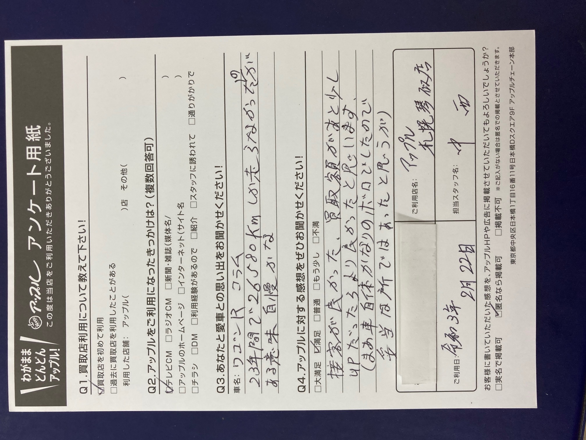 接客が良かった、買取額があと少しUPだったら良かったと思います。(まあ車自体かなりのボロでしたので妥当な所ではあったと思うが)