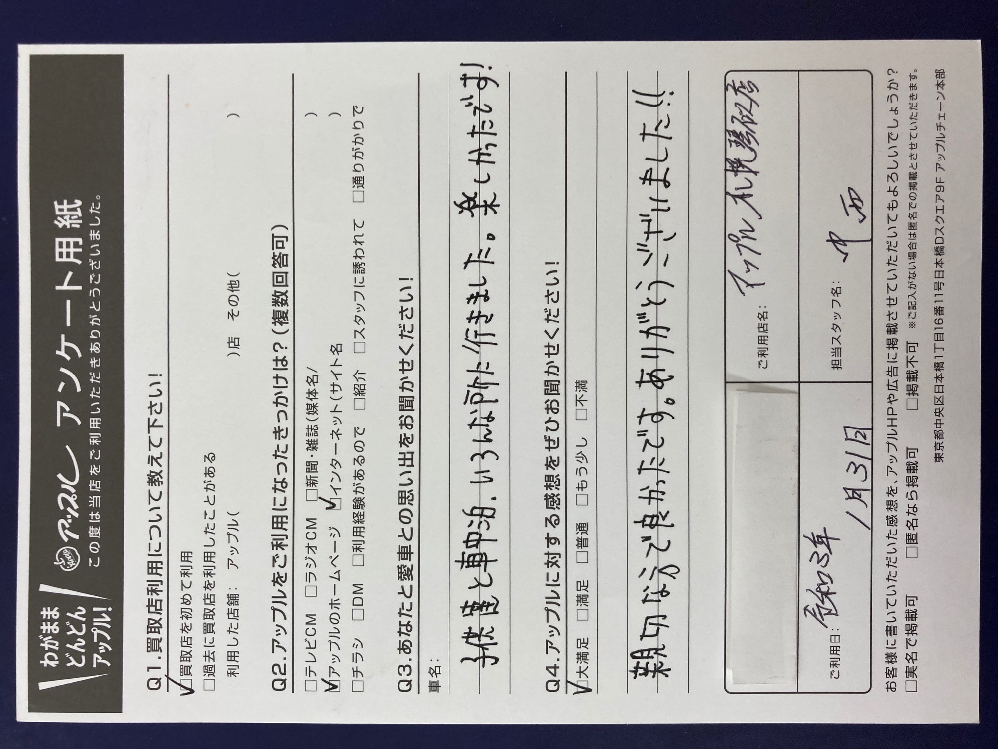 お車のご相談・ 査定だけでもOK! カンタン 入力 30秒 アップルがブランド買取始めました! お電話でも受付中! 受付時間10:00 ~ 18:00 0120-002-077 お車のご相談・ 査定だけでもOK! カンタン 入力 30秒 アップルがブランド買取始めました! お電話でも受付中! 受付時間10:00 ~ 18:00 0120-002-077 アップルがブランド買取始めました! お電話でも受付中! 受付時間10:00 ~ 18:00 0120-002-077 店舗情報 在庫車 スタッフ紹介 ブログ お客様の声 キャンペーン お得 無料査定 click お客様の声 ご記入日: 2021/01/31 岩内町 U様 車名:トヨタ エスティマ 〈あなたと愛車との思い出をお聞かせ下さい!〉子供達と車中泊、いろんな所に行きました。楽しかったです!〈アップルに対する感想をぜひお聞かせください!〉親切な方で良かったです。ありがとうございました!! 前へ 次へ お客様の声一覧を見る
