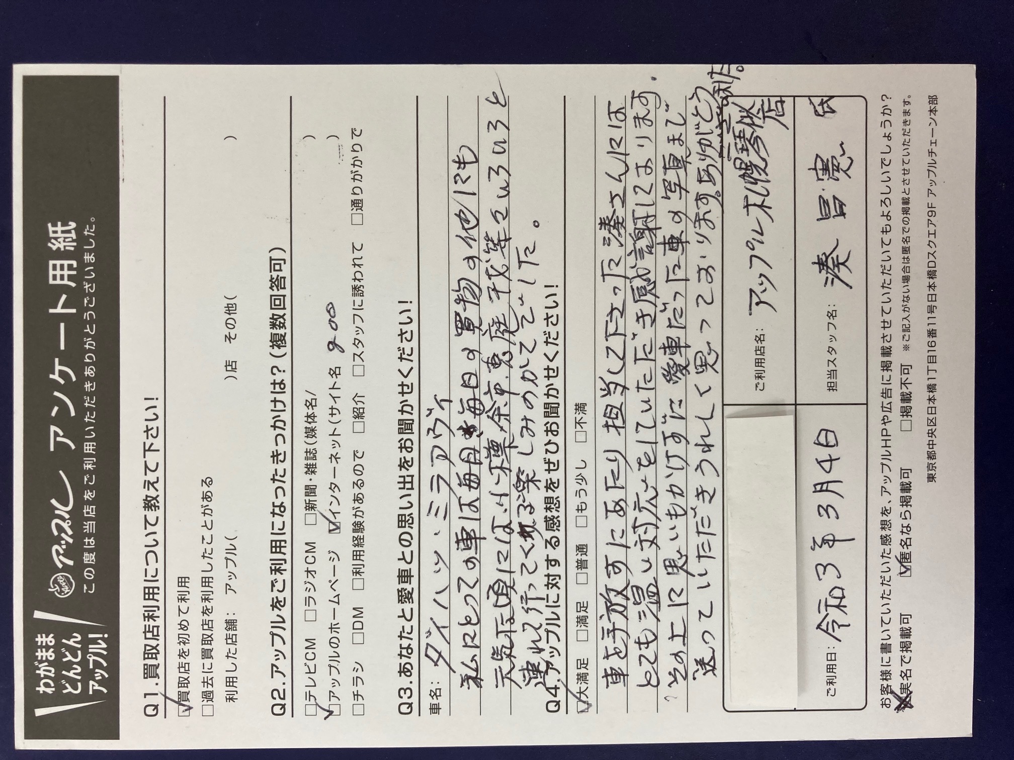 車を手放すにあたり担当して下さった湊さんにはとても温かい対応をしていただき感謝しております。その上に思いもかけずに愛車だった車の写真まで送っていただきうれしく思っております。ありがとうございました。