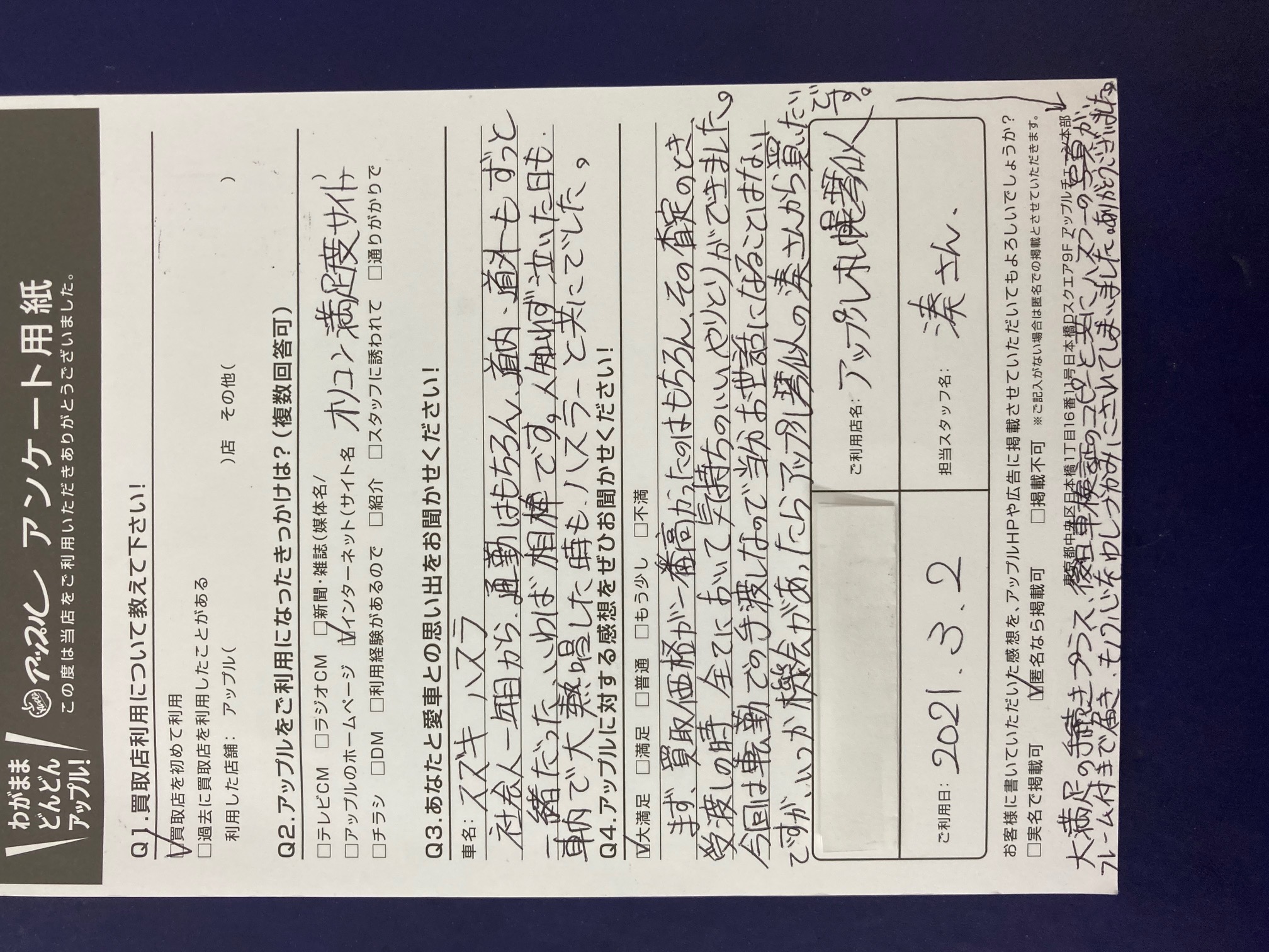 まず買取価格が一番高かったのはもちろん、その査定のとき受け渡しの時全てにおいて気持のいいやりとりができました。今回は転勤での手放しなので当分お世話になることはないですが、いつか機会があったらアップル琴似の湊さんから買いたいです。大満足の手続きプラス後日車検証のコピーと共にハスラーの写真がフレーム付きで届き、もう心をわしずかみにされてしました。ありがとうございました。