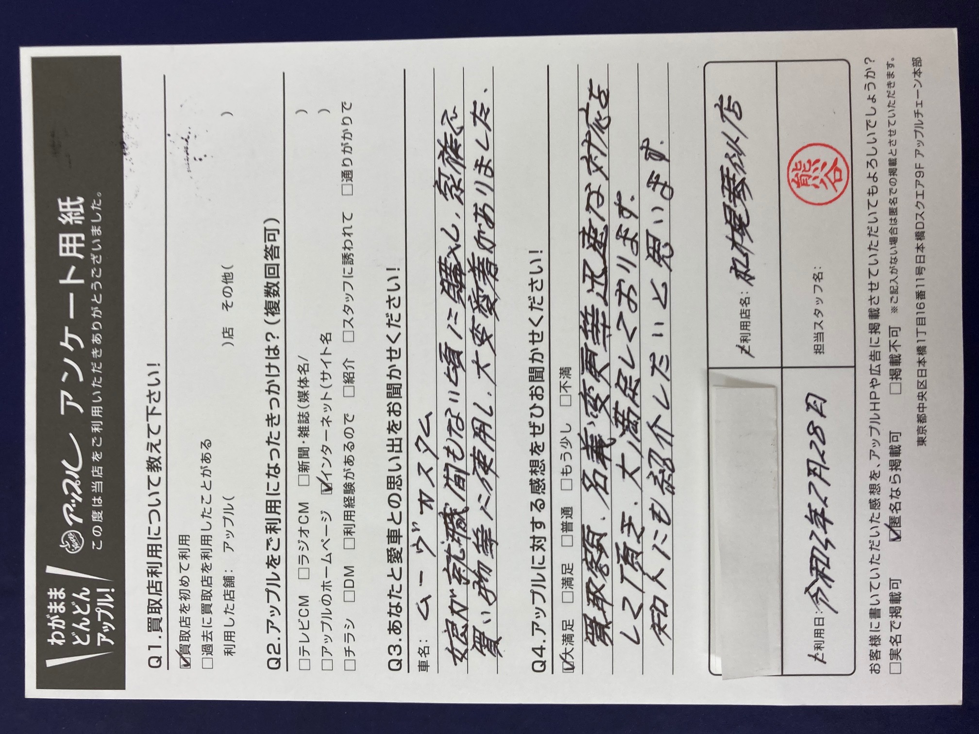 お車のご相談・ 査定だけでもOK! カンタン 入力 30秒 アップルがブランド買取始めました! お電話でも受付中! 受付時間10:00 ~ 18:00 0120-002-077 お車のご相談・ 査定だけでもOK! カンタン 入力 30秒 アップルがブランド買取始めました! お電話でも受付中! 受付時間10:00 ~ 18:00 0120-002-077 アップルがブランド買取始めました! お電話でも受付中! 受付時間10:00 ~ 18:00 0120-002-077 店舗情報 在庫車 スタッフ紹介 ブログ お客様の声 キャンペーン お得 無料査定 click お客様の声 ご記入日: 2021/02/28 札幌市中央区 S様 車名:ダイハツ ムーヴ 〈あなたと愛車との思い出をお聞かせください!〉娘が就職間もない頃に購入し家族で買い物等に使用し大変愛着がありました。〈アップルに対する感想をぜひお聞かせください!〉買取額、名義変更等迅速な対応をして頂き大変満足しております。知人にも紹介したいと思います。 前へ 次へ お客様の声一覧を見る