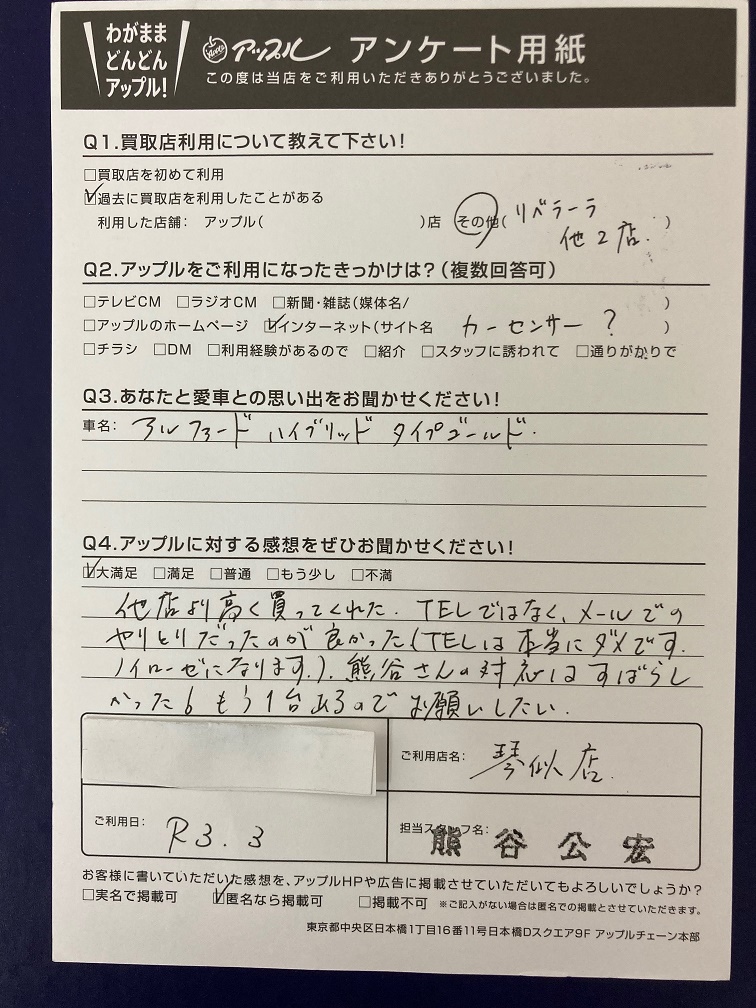 お車のご相談・ 査定だけでもOK! カンタン 入力 30秒 アップルがブランド買取始めました! お電話でも受付中! 受付時間10:00 ~ 18:00 0120-002-077 お車のご相談・ 査定だけでもOK! カンタン 入力 30秒 アップルがブランド買取始めました! お電話でも受付中! 受付時間10:00 ~ 18:00 0120-002-077 アップルがブランド買取始めました! お電話でも受付中! 受付時間10:00 ~ 18:00 0120-002-077 店舗情報 在庫車 スタッフ紹介 ブログ お客様の声 キャンペーン お得 無料査定 click お客様の声 ご記入日: 2021/03/03 札幌市西区 H様 車名:トヨタ アルファードハイブリッド(~H26年12月) 〈アップルに対する感想をぜひお聞かせください!〉他社より高く買い取ってくれた。TELではなくメールでのやりとりだったのが良かった(TELは本当にダメです。ノイローゼになります)熊谷さんの対応はすばらしかった!もう1台あるのでお願いしたい。 前へ 次へ お客様の声一覧を見る