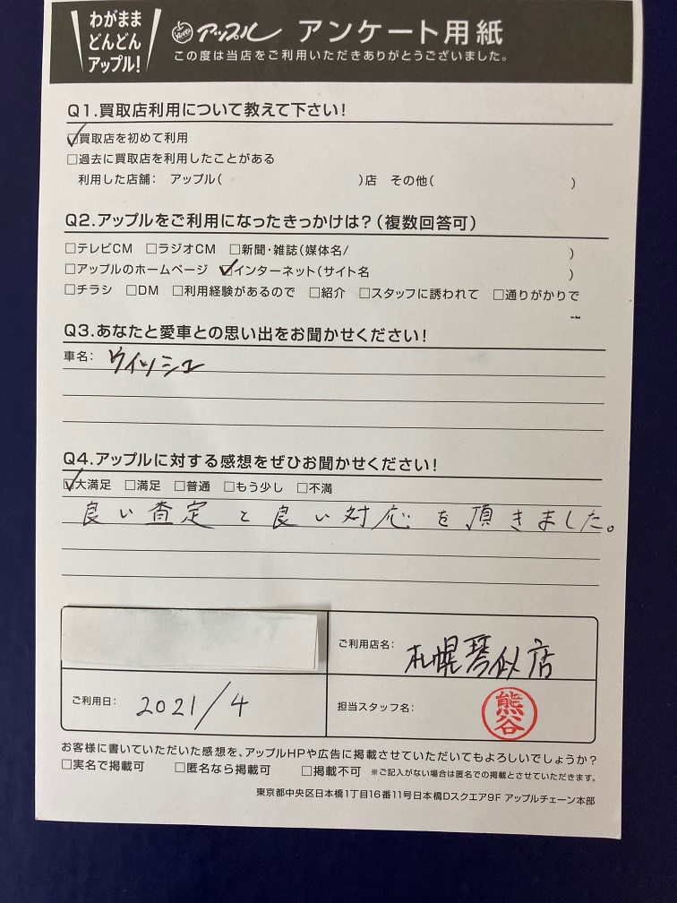 お車のご相談・ 査定だけでもOK! カンタン 入力 30秒 アップルがブランド買取始めました! お電話でも受付中! 受付時間10:00 ~ 18:00 0120-002-077 お車のご相談・ 査定だけでもOK! カンタン 入力 30秒 アップルがブランド買取始めました! お電話でも受付中! 受付時間10:00 ~ 18:00 0120-002-077 アップルがブランド買取始めました! お電話でも受付中! 受付時間10:00 ~ 18:00 0120-002-077 店舗情報 在庫車 スタッフ紹介 ブログ お客様の声 キャンペーン お得 無料査定 click お客様の声 ご記入日: 2021/04/05 苫小牧市 S様 車名:トヨタ ウィッシュ 〈アップルに対する感想をぜひお聞かせください!〉良い査定と良い対応を頂きました。 前へ 次へ お客様の声一覧を見る