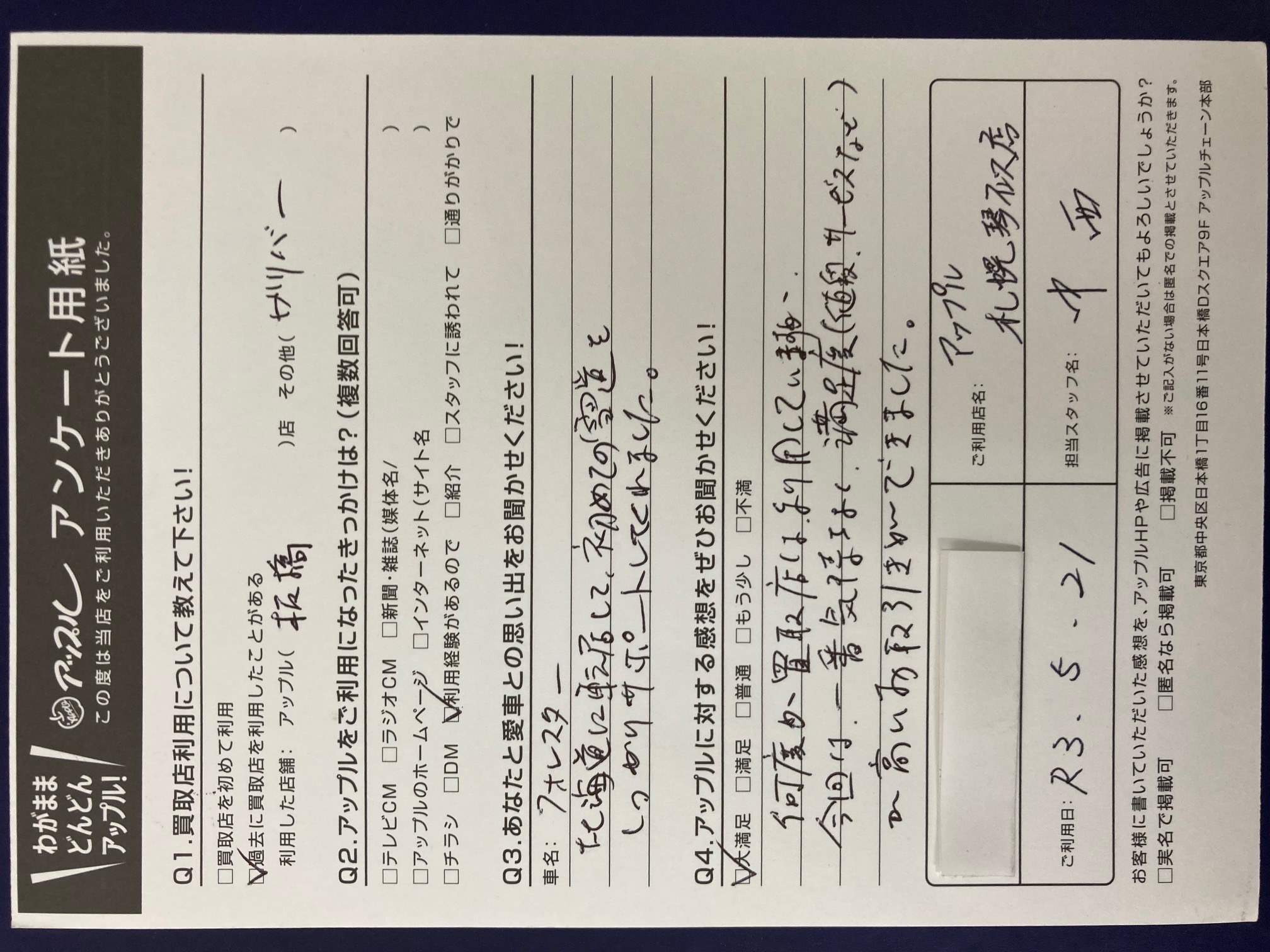 お車のご相談・ 査定だけでもOK! カンタン 入力 30秒 アップルがブランド買取始めました! お電話でも受付中! 受付時間10:00 ~ 18:00 0120-002-077 お車のご相談・ 査定だけでもOK! カンタン 入力 30秒 アップルがブランド買取始めました! お電話でも受付中! 受付時間10:00 ~ 18:00 0120-002-077 アップルがブランド買取始めました! お電話でも受付中! 受付時間10:00 ~ 18:00 0120-002-077 店舗情報 在庫車 スタッフ紹介 ブログ お客様の声 キャンペーン お得 無料査定 click お客様の声 ご記入日: 2021/05/21 中央区 N様 車名:スバル フォレスター 〈あなたと愛車との思い出をお聞かせください!〉北海道に転居して初めての雪道をしっかりサポートしてくれました。〈アップルに対する感想をぜひお聞かせください!〉何度か買取店は利用していますが、今回は一番気持ちよく満足度(値段、サービスなど)が高いお取引ができました。 前へ 次へ お客様の声一覧を見る