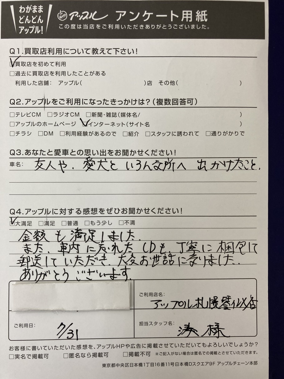 お車のご相談・ 査定だけでもOK! カンタン 入力 30秒 アップルがブランド買取始めました! お電話でも受付中! 受付時間10:00 ~ 18:00 0120-002-077 お車のご相談・ 査定だけでもOK! カンタン 入力 30秒 アップルがブランド買取始めました! お電話でも受付中! 受付時間10:00 ~ 18:00 0120-002-077 アップルがブランド買取始めました! お電話でも受付中! 受付時間10:00 ~ 18:00 0120-002-077 店舗情報 在庫車 スタッフ紹介 ブログ お客様の声 キャンペーン お得 無料査定 click お客様の声 ご記入日: 2021/07/31 伊達市 K様 車名:トヨタ アクア 〈あなたと愛車との思い出をお聞かせください!〉友人や愛犬といろんな所へ出かけたこと〈アップルに対する感想をぜひお聞かせください!〉金額も満足しました。また社内に忘れたCDも丁寧に梱包して郵送していただき大変お世話になりました。ありがとうございます。 前へ 次へ お客様の声一覧を見る
