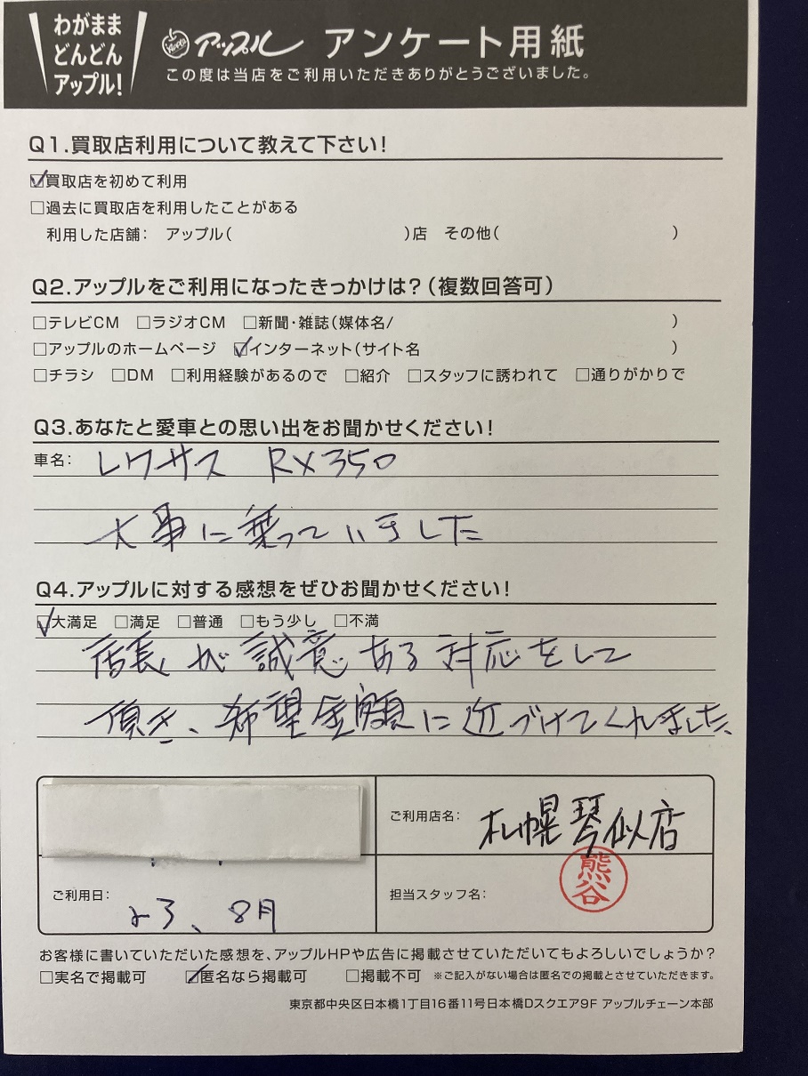 お車のご相談・ 査定だけでもOK! カンタン 入力 30秒 アップルがブランド買取始めました! お電話でも受付中! 受付時間10:00 ~ 18:00 0120-002-077 お車のご相談・ 査定だけでもOK! カンタン 入力 30秒 アップルがブランド買取始めました! お電話でも受付中! 受付時間10:00 ~ 18:00 0120-002-077 アップルがブランド買取始めました! お電話でも受付中! 受付時間10:00 ~ 18:00 0120-002-077 店舗情報 在庫車 スタッフ紹介 ブログ お客様の声 キャンペーン お得 無料査定 click お客様の声 ご記入日: 2021/08/26 東神楽町 N様 車名:レクサス RX (国内仕様 右H(H27年10月~HYBRID含) 〈あなたと愛車との思い出をお聞かせください!〉大事に乗っていました。〈アップルに対する感想をぜひお聞かせください!〉店長が誠意ある対応して頂き、希望金額に近づけてくれました。 前へ 次へ お客様の声一覧を見る