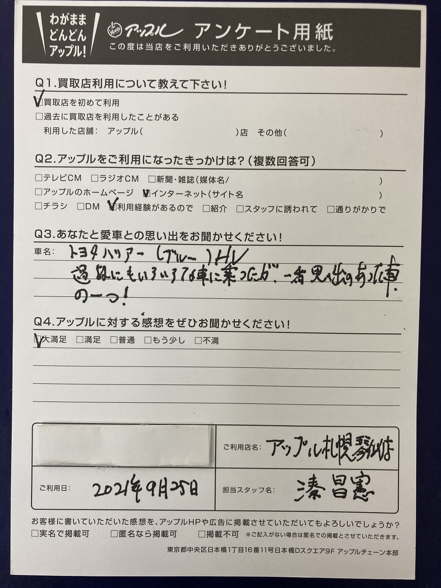 お車のご相談・ 査定だけでもOK! カンタン 入力 30秒 アップルがブランド買取始めました! お電話でも受付中! 受付時間10:00 ~ 18:00 0120-002-077 お車のご相談・ 査定だけでもOK! カンタン 入力 30秒 アップルがブランド買取始めました! お電話でも受付中! 受付時間10:00 ~ 18:00 0120-002-077 アップルがブランド買取始めました! お電話でも受付中! 受付時間10:00 ~ 18:00 0120-002-077 店舗情報 在庫車 スタッフ紹介 ブログ お客様の声 キャンペーン お得 無料査定 click お客様の声 ご記入日: 2021/09/25 札幌市中央区 O様 車名:トヨタ ハリアーハイブリッド (~H25年7月) 〈あなたと愛車との思い出をお聞かせください!〉過去にもいろいろな車に乗ったが、一番思い出のあった車の一つ! 前へ 次へ お客様の声一覧を見る