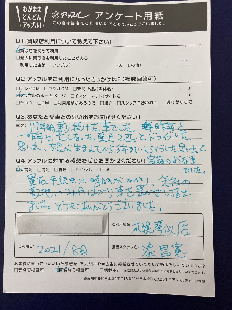 買取り手続きに時間がかかり、会社の敷地に2か月ばかり車を置かせて頂きました。どうもありがとうございました。