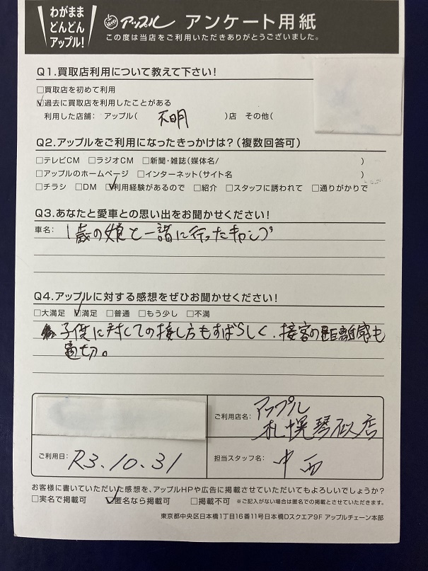 お車のご相談・ 査定だけでもOK! カンタン 入力 30秒 アップルがブランド買取始めました! お電話でも受付中! 受付時間10:00 ~ 18:00 0120-002-077 お車のご相談・ 査定だけでもOK! カンタン 入力 30秒 アップルがブランド買取始めました! お電話でも受付中! 受付時間10:00 ~ 18:00 0120-002-077 アップルがブランド買取始めました! お電話でも受付中! 受付時間10:00 ~ 18:00 0120-002-077 店舗情報 在庫車 スタッフ紹介 ブログ お客様の声 キャンペーン お得 無料査定 click お客様の声 ご記入日: 2021/10/31 札幌市中央区 K様 車名:トヨタ C-HR 〈あなたと愛車との思い出をお聞かせください!〉1歳の娘と一緒に行ったキャンプ〈アップルに対する感想をぜひお聞かせください!〉子供に対しての接し方もすばらしく、接客の距離感も適切 前へ 次へ お客様の声一覧を見る
