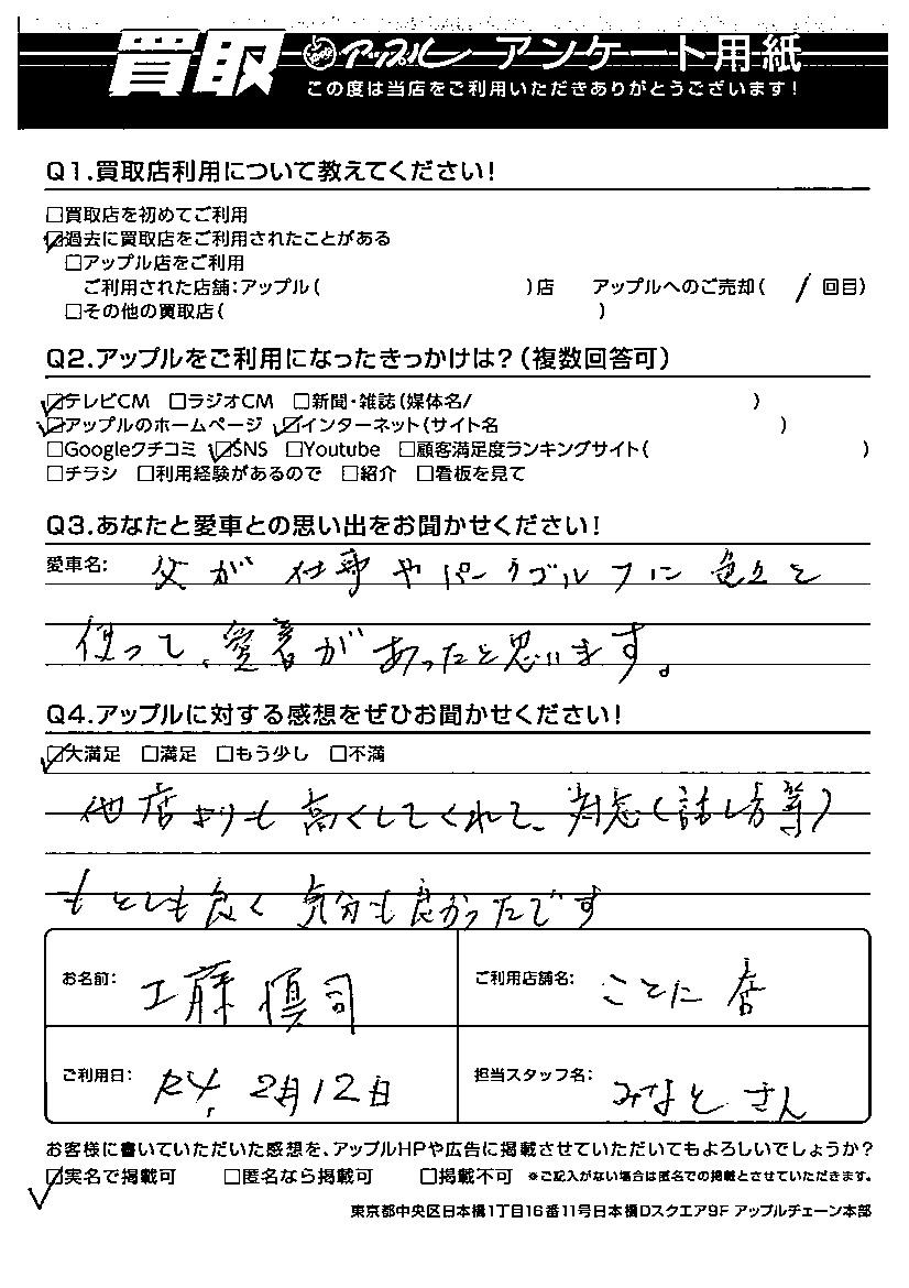 お車のご相談・ 査定だけでもOK! カンタン 入力 30秒 アップルがブランド買取始めました! お電話でも受付中! 受付時間10:00 ~ 18:00 0120-002-077 お車のご相談・ 査定だけでもOK! カンタン 入力 30秒 アップルがブランド買取始めました! お電話でも受付中! 受付時間10:00 ~ 18:00 0120-002-077 アップルがブランド買取始めました! お電話でも受付中! 受付時間10:00 ~ 18:00 0120-002-077 店舗情報 在庫車 スタッフ紹介 ブログ お客様の声 キャンペーン お得 無料査定 click お客様の声 ご記入日: 2022/02/12 工藤慎司様 Q:あなたと愛車との思い出をお聞かせください!父が仕事やパークゴルフに色々と使って、愛着があったと思います。Q:アップルに対する感想をぜひお聞かせください!大満足他店より高くしてくれて、対応(話し方等)もとても良く気分も良かったです。担当:アップル札幌琴似店 湊 前へ 次へ お客様の声一覧を見る