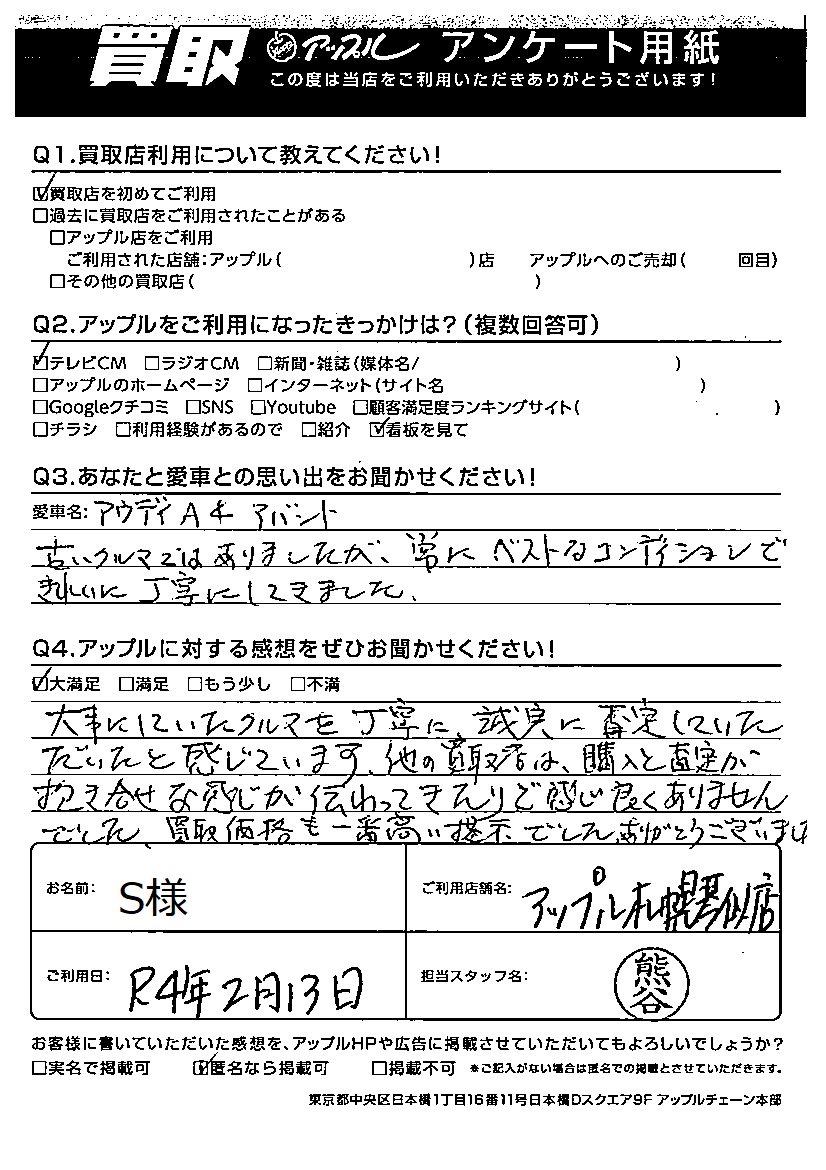大事にしていたクルマを丁寧に誠実に査定していただいたと感じています。他の買取店は、購入と査定が抱き合わせな感じが伝わってきたりと感じ良くありませんでした。買取価格も一番高い提示でした。ありがとうございました。