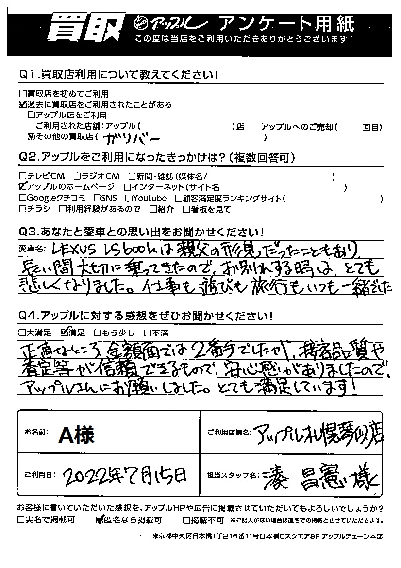 正直なところ、金額面では2番手でしたが、接客品質や査定等が信頼できるもので、安心感がありましたので、アップルさんにお願いしました。