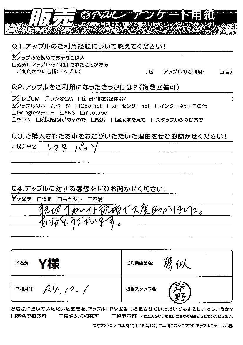 お車のご相談・ 査定だけでもOK! カンタン 入力 30秒 アップルがブランド買取始めました! お電話でも受付中! 受付時間10:00 ~ 18:00 0120-002-077 お車のご相談・ 査定だけでもOK! カンタン 入力 30秒 アップルがブランド買取始めました! お電話でも受付中! 受付時間10:00 ~ 18:00 0120-002-077 アップルがブランド買取始めました! お電話でも受付中! 受付時間10:00 ~ 18:00 0120-002-077 店舗情報 在庫車 スタッフ紹介 ブログ お客様の声 キャンペーン お得 無料査定 click お客様の声 ご記入日: 2022/10/01 Y様 車名:トヨタ パッソ Q:アップルに対する感想をぜひお聞かせください!大満足親切丁ねいな説明で大変助かりました。ありがとうございます。 前へ 次へ お客様の声一覧を見る