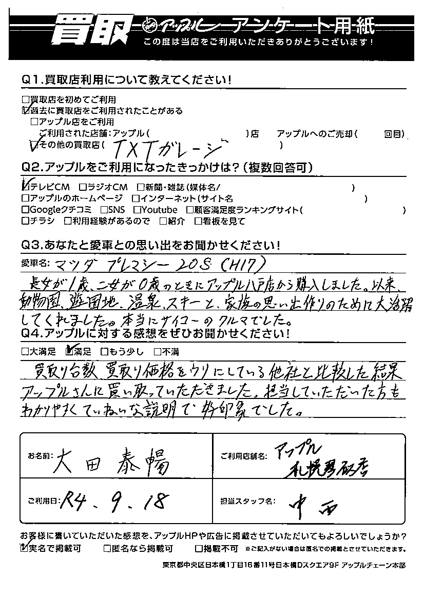大田泰暢様 車名:マツダ プレマシー