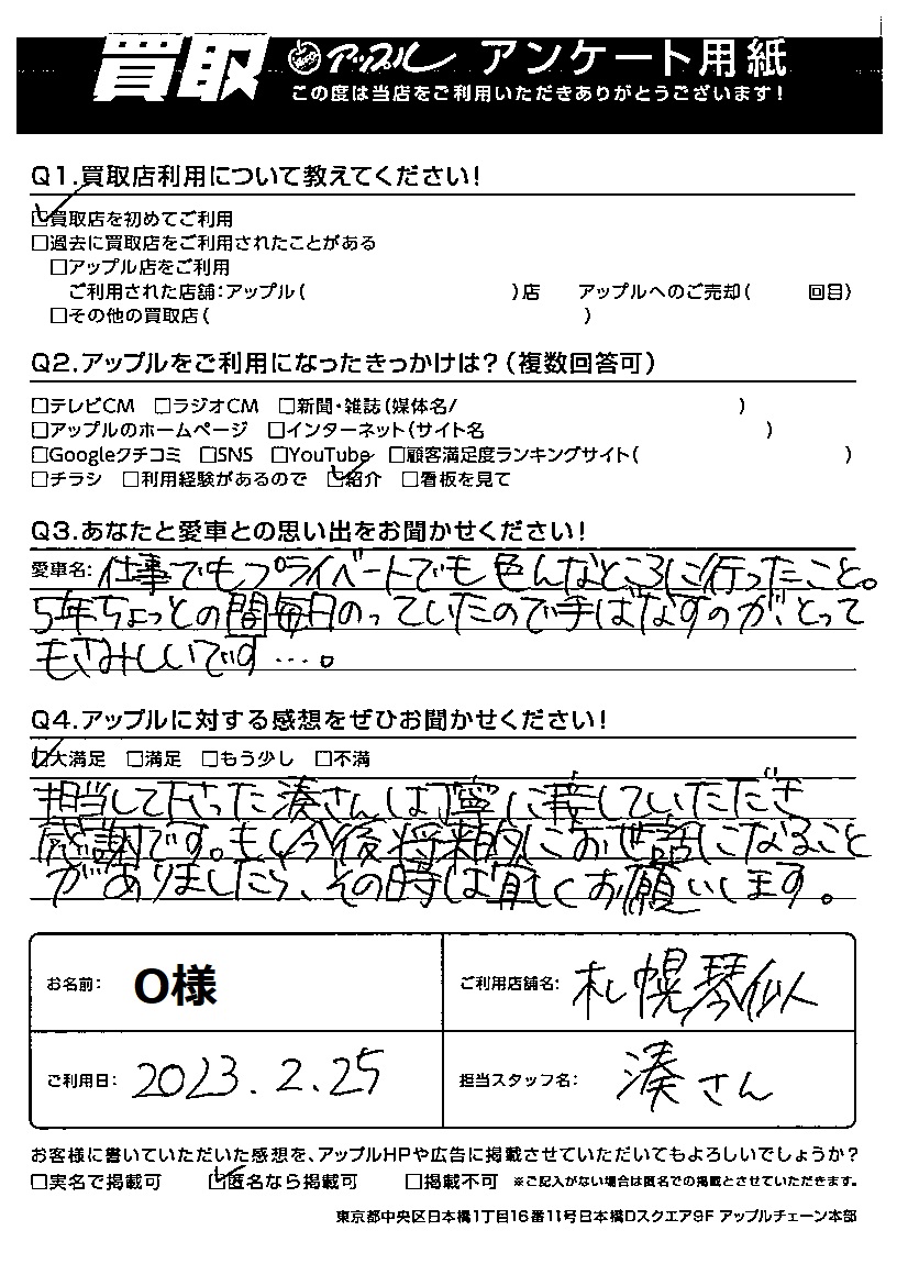 担当して下さった湊さんは丁寧に接していただき感謝です。もし今後将来的にお世話になることがありましたら、その時は宜しくお願いします。
