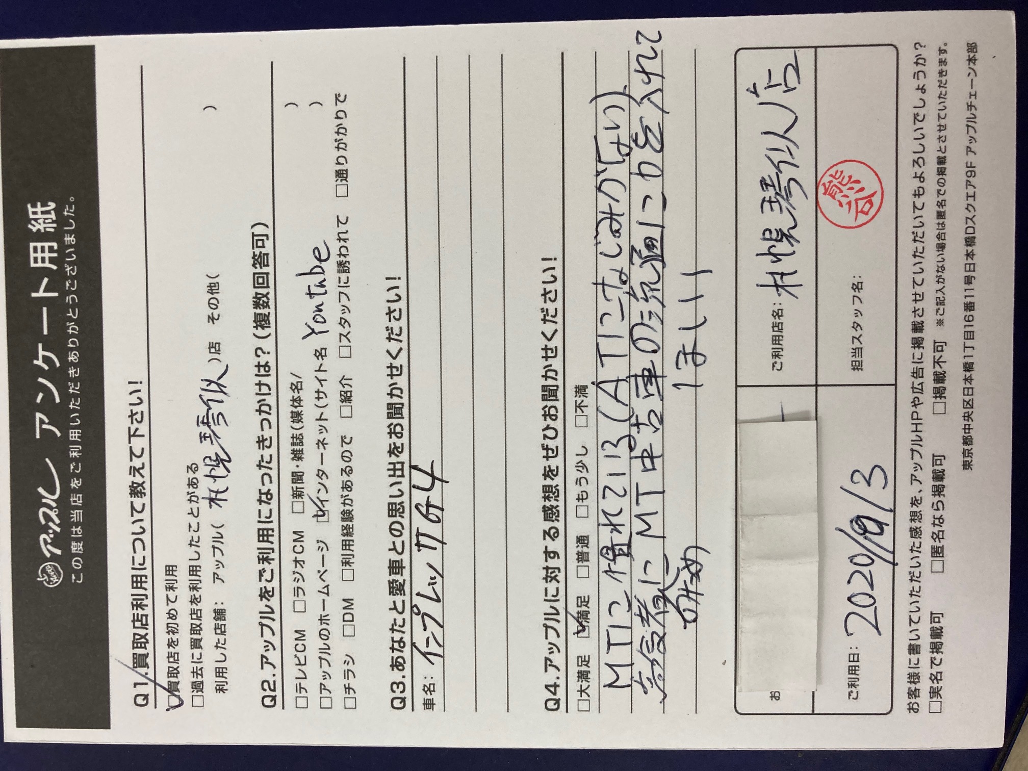 お車のご相談・ 査定だけでもOK! カンタン 入力 30秒 アップルがブランド買取始めました! お電話でも受付中! 受付時間10:00 ~ 18:00 0120-002-077 お車のご相談・ 査定だけでもOK! カンタン 入力 30秒 アップルがブランド買取始めました! お電話でも受付中! 受付時間10:00 ~ 18:00 0120-002-077 アップルがブランド買取始めました! お電話でも受付中! 受付時間10:00 ~ 18:00 0120-002-077 店舗情報 在庫車 スタッフ紹介 ブログ お客様の声 キャンペーン お得 無料査定 click お客様の声 ご記入日: 2020/10/03 中央区 H様 車名:スバル インプレッサG4 〈アップルに対する感想をぜひお聞かせください!〉MTに慣れている(ATになじみがない)高齢者のためMT中古車の流通に力を入れてほしい。 前へ 次へ お客様の声一覧を見る
