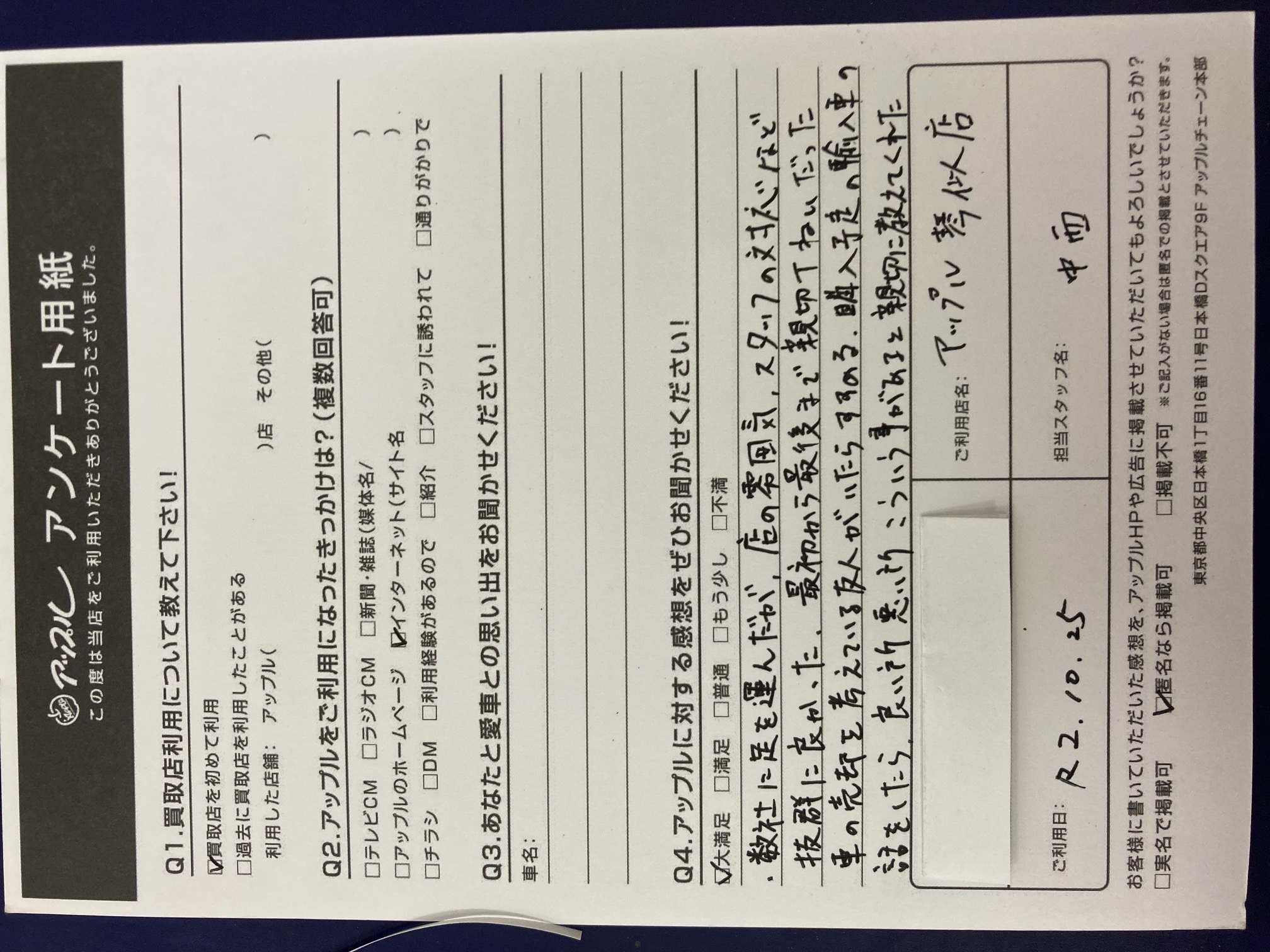 お車のご相談・ 査定だけでもOK! カンタン 入力 30秒 アップルがブランド買取始めました! お電話でも受付中! 受付時間10:00 ~ 18:00 0120-002-077 お車のご相談・ 査定だけでもOK! カンタン 入力 30秒 アップルがブランド買取始めました! お電話でも受付中! 受付時間10:00 ~ 18:00 0120-002-077 アップルがブランド買取始めました! お電話でも受付中! 受付時間10:00 ~ 18:00 0120-002-077 店舗情報 在庫車 スタッフ紹介 ブログ お客様の声 キャンペーン お得 無料査定 click お客様の声 ご記入日: 2020/10/25 白石区 T様 車名:スバル フォレスター 〈アップルに対する感想をぜひお聞かせください!〉数社に足を運んだが、店の雰囲気、スタッフの対応など抜群に良かった。最初から最後まで親切丁寧だった。車の売却を考えている友人がいたらすすめる。購入予定の輸入車の話をしたら良い所悪い所こういう事があると親切に教えてくれた。 前へ 次へ お客様の声一覧を見る