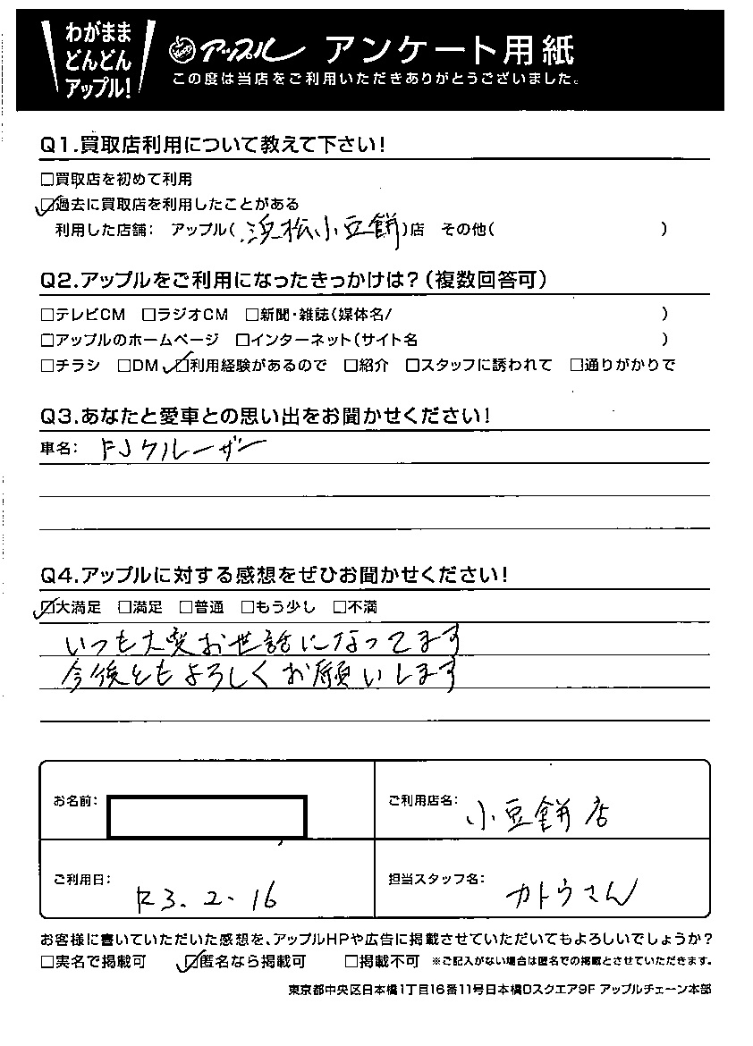 お車のご相談・ 査定だけでもOK! カンタン 入力 30秒 アップルがブランド買取始めました! お電話でも受付中! 受付時間10:00 ~ 18:30 053-437-7711 お車のご相談・ 査定だけでもOK! カンタン 入力 30秒 アップルがブランド買取始めました! お電話でも受付中! 受付時間10:00 ~ 18:30 053-437-7711 アップルがブランド買取始めました! お電話でも受付中! 受付時間10:00 ~ 18:30 053-437-7711 店舗情報 在庫車 スタッフ紹介 ブログ お客様の声 キャンペーン 無料査定 click お客様の声 ご記入日: 2021/02/16 S.E様 車名:トヨタ FJクルーザー(国内モデル 右H) Q:あなたと愛車の思い出をお聞かせください。 Q:アップルに対する感想をぜひお聞かせください。 いつもお世話になっています 今後ともよろしくお願いします 前へ 次へ お客様の声一覧を見る