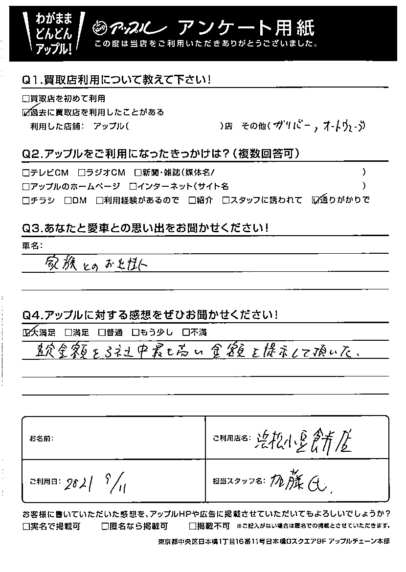 お車のご相談・ 査定だけでもOK! カンタン 入力 30秒 アップルがブランド買取始めました! お電話でも受付中! 受付時間10:00 ~ 18:30 053-437-7711 お車のご相談・ 査定だけでもOK! カンタン 入力 30秒 アップルがブランド買取始めました! お電話でも受付中! 受付時間10:00 ~ 18:30 053-437-7711 アップルがブランド買取始めました! お電話でも受付中! 受付時間10:00 ~ 18:30 053-437-7711 店舗情報 在庫車 スタッフ紹介 ブログ お客様の声 キャンペーン 無料査定 click お客様の声 ご記入日: 2021/09/11 D.U様 車名:スバル ドミンゴ Q:あなたと愛車の思い出をお聞かせください。 家族とのお出掛けQ:アップルに対する感想をぜひお聞かせください。 査定額を3社中最も高い金額を提示して頂いた。 前へ 次へ お客様の声一覧を見る