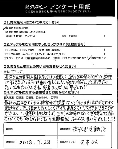 A:長女が幼稚園入園をきっかけに購入。約10年色々な所へ旅行に行きました。時には車中泊したり、寝たり食べたりと車内での思い出もたくさんです。愛着たっぷりの車でした!!
